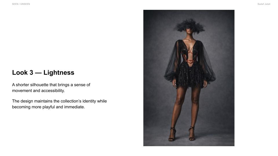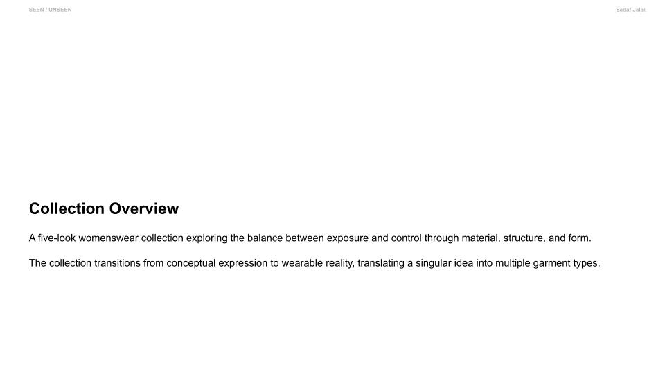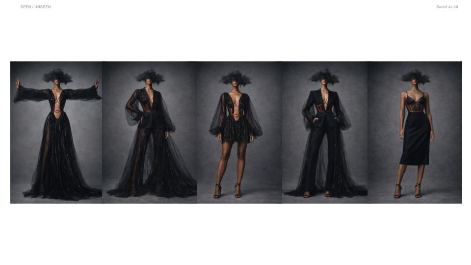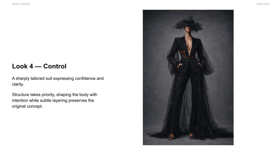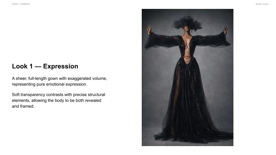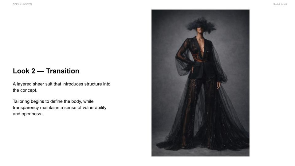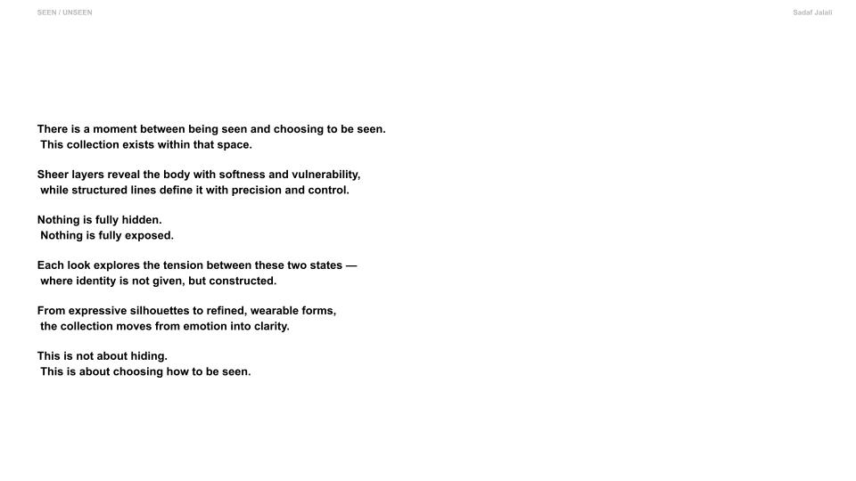 Seen / Unseen explores the space between visibility and control. Through sheer layering and structured tailoring, the collection reveals and defines the body at the same time. Soft transparency expresses vulnerability, while precise lines and harness details introduce strength and intention. Each look transitions from expressive, conceptual silhouettes to simplified, wearable forms. The collection reflects how identity is not fixed, but shaped — a balance between what is shown and what is held back. It is an exploration of choosing how to be seen.