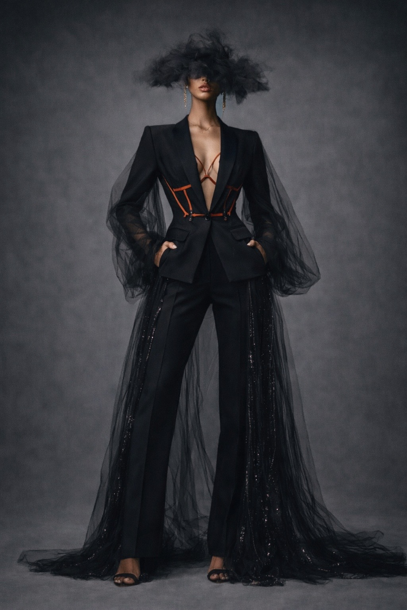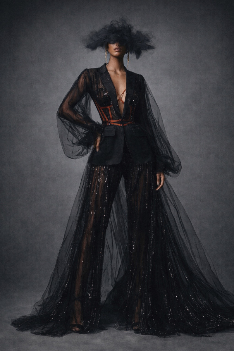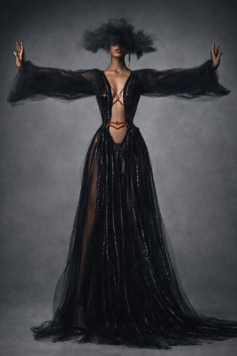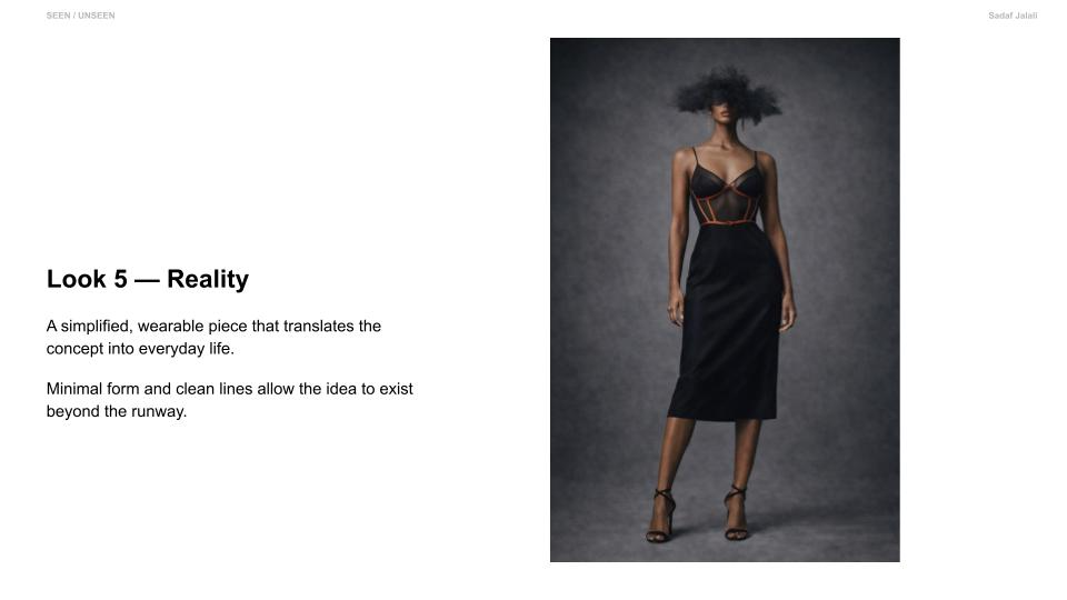 Seen / Unseen explores the space between visibility and control. Through sheer layering and structured tailoring, the collection reveals and defines the body at the same time. Soft transparency expresses vulnerability, while precise lines and harness details introduce strength and intention. Each look transitions from expressive, conceptual silhouettes to simplified, wearable forms. The collection reflects how identity is not fixed, but shaped — a balance between what is shown and what is held back. It is an exploration of choosing how to be seen.