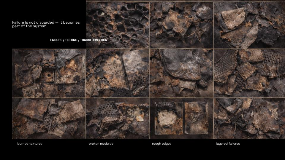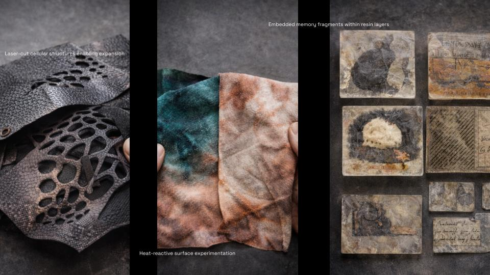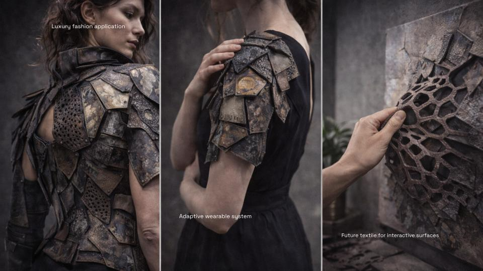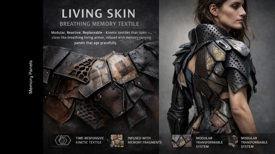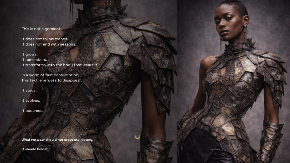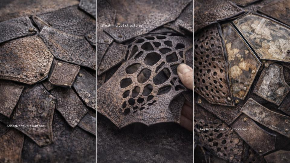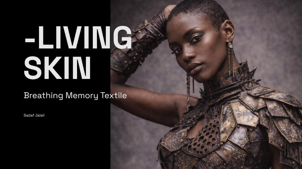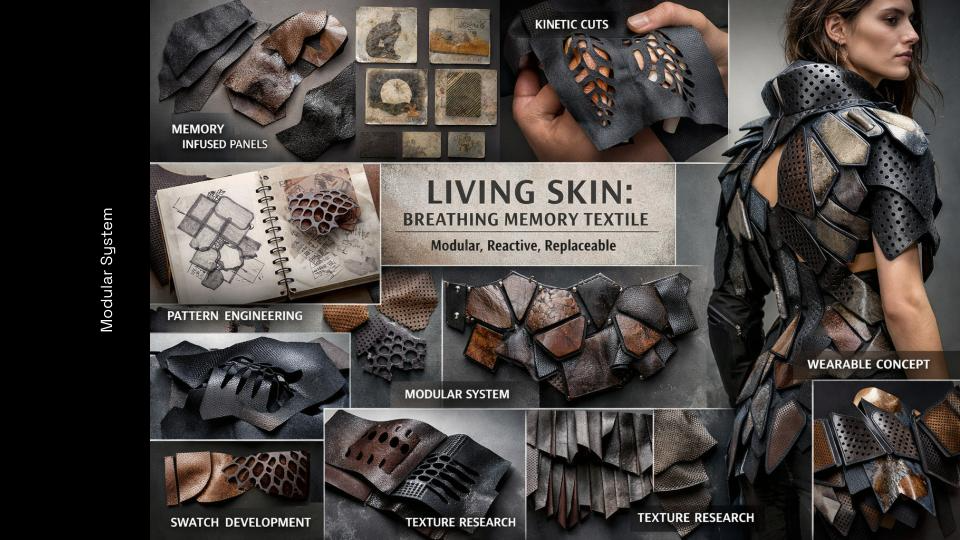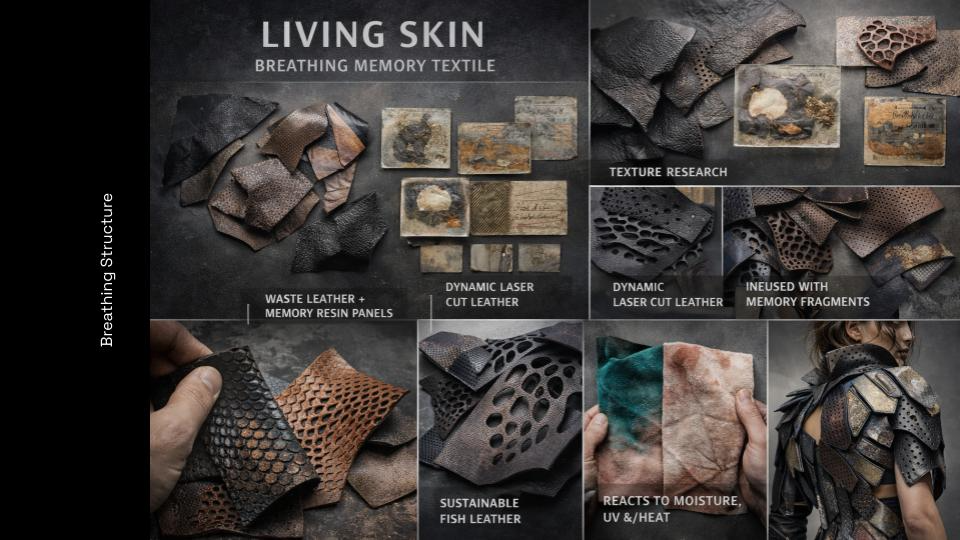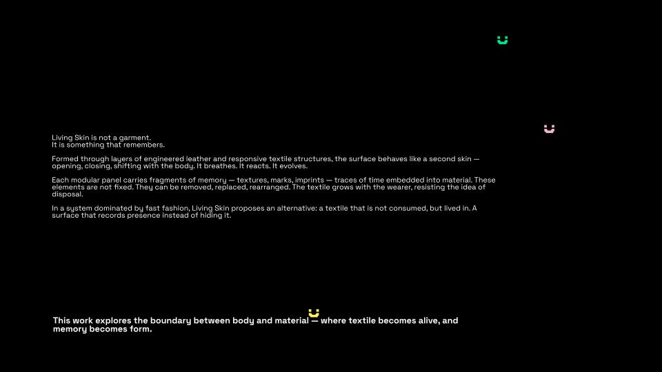 Living Skin began with a question: what if a textile could remember? Not memory as nostalgia, but as material. As surface. As something that lives with us, changes with us, and refuses to disappear. This work explores the body as a site of time — where every movement leaves a trace, and every trace becomes part of form. Through layers of engineered leather and responsive structures, the textile behaves like a second skin: opening, closing, breathing with the wearer. It is not fixed. It evolves. Each panel carries fragments — marks, imprints, textures — embedded histories that can be removed, replaced, and rearranged. The garment is never finished. It grows through use, resisting the cycle of consumption that defines fashion today. I was interested in creating a system rather than an object. A textile that extends beyond a single moment of design, and instead becomes something ongoing — shaped by the person who inhabits it. In a culture built on speed and replacement, Living Skin proposes a different relationship with material. One that values duration, transformation, and presence. This project sits between structure and softness, permanence and change, body and material — questioning where one ends and the other begins. What we wear should not erase our history. It should hold it.