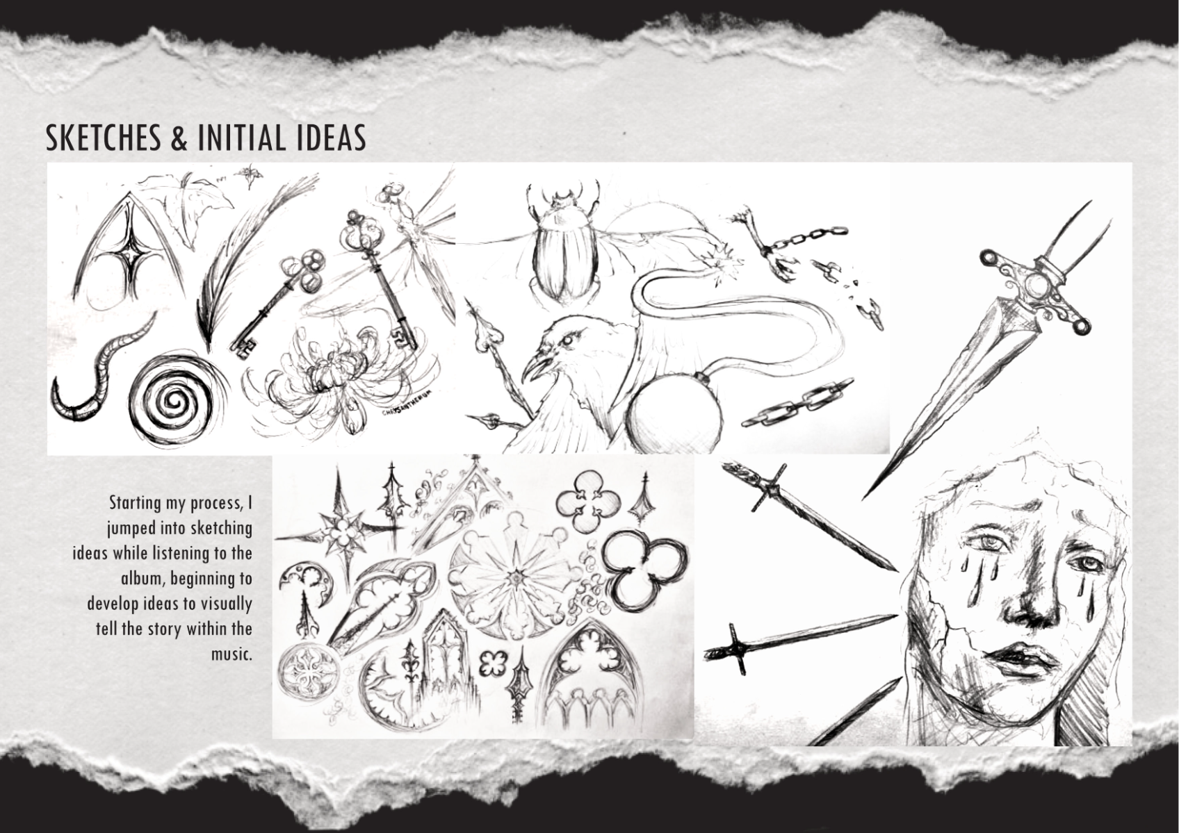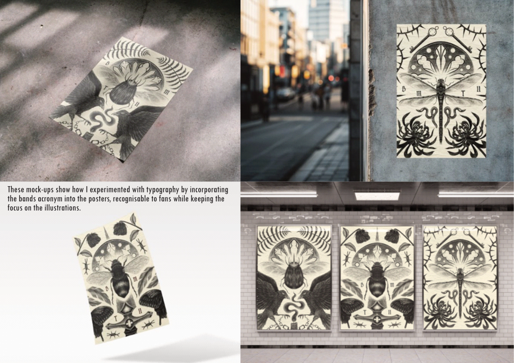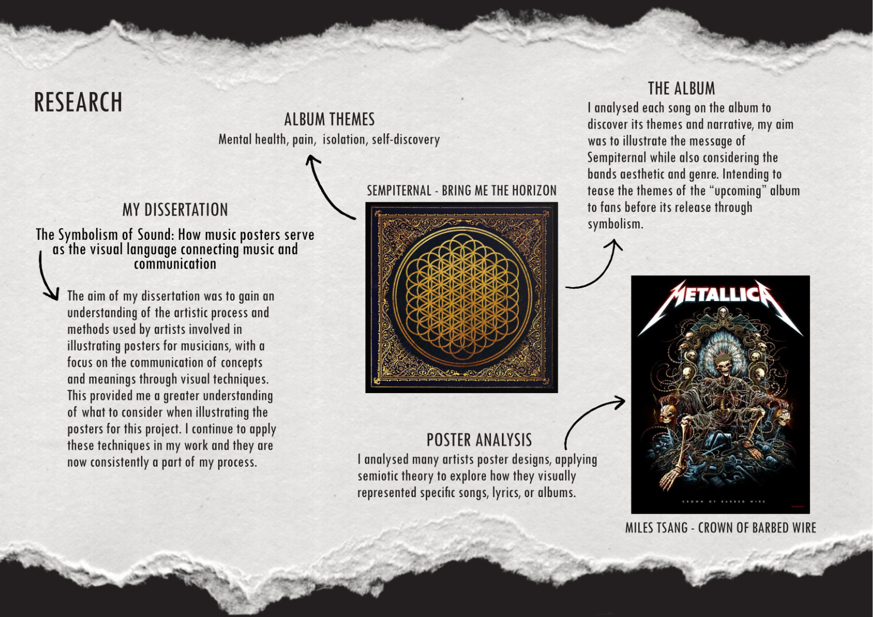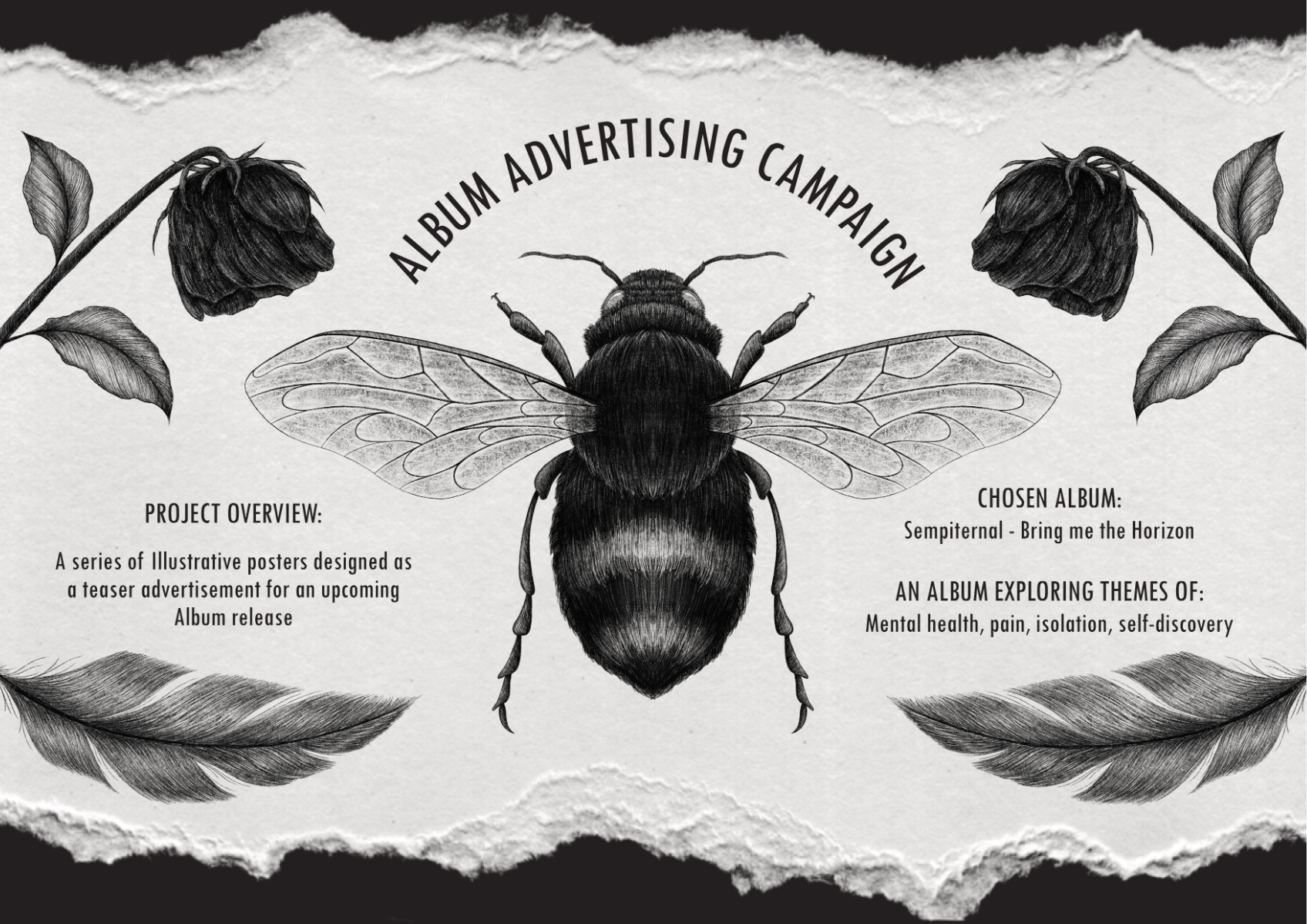 This project explores a fictional campaign where posters serve as a visual teaser, promoting the release of the album Sempiternal by Bring Me the Horizon. Considering the album’s themes, the band’s aesthetic, and music genre, the narrative is visually interpreted through illustrating symbolic imagery that effectively communicates the chosen album’s identity.
