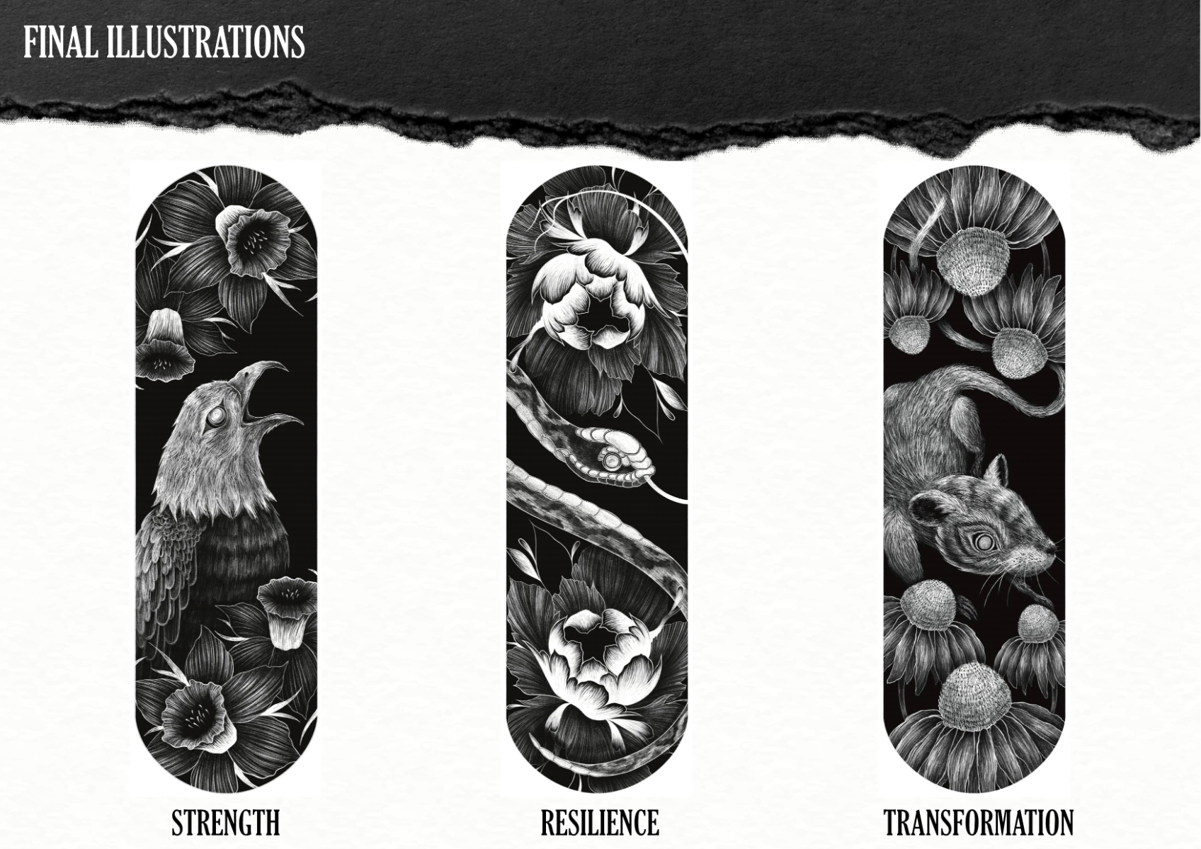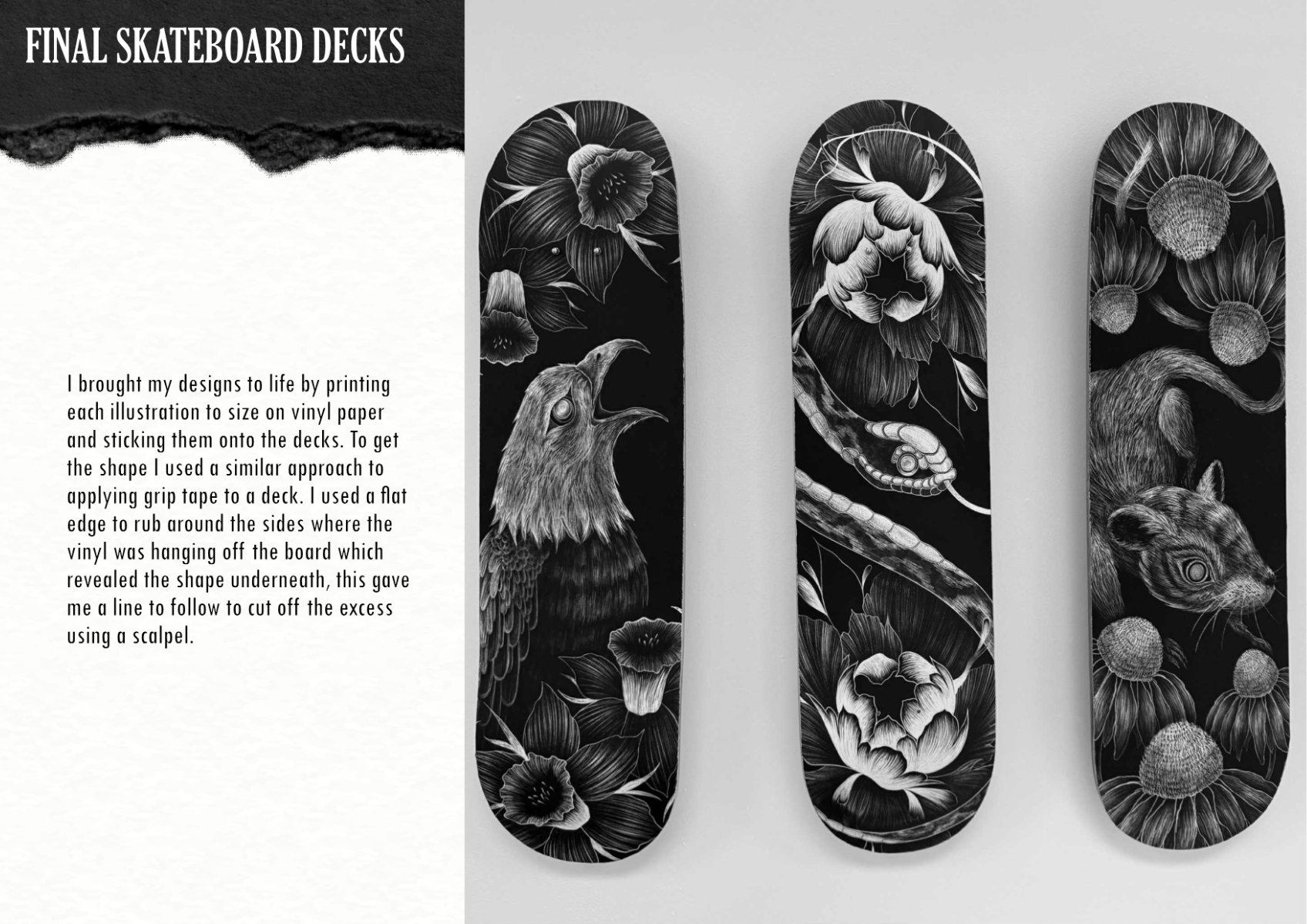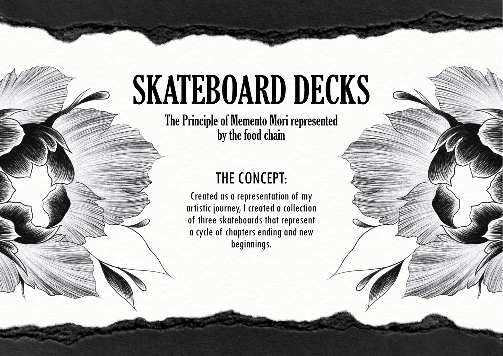 This project applies the concept of Memento mori (Latin for remember you must die) through symbolism and intricate illustrations over a series of skateboard designs. This concept is represented by the food chain, a portrayal of predator and prey across the three boards, from bird, to snake, to rodent. Each piece explores symbolism, intertwining animals and flowers representing strength, transformation and resilience. This work stands as visual representation of my artistic journey, a cycle of chapters ending and new beginnings.