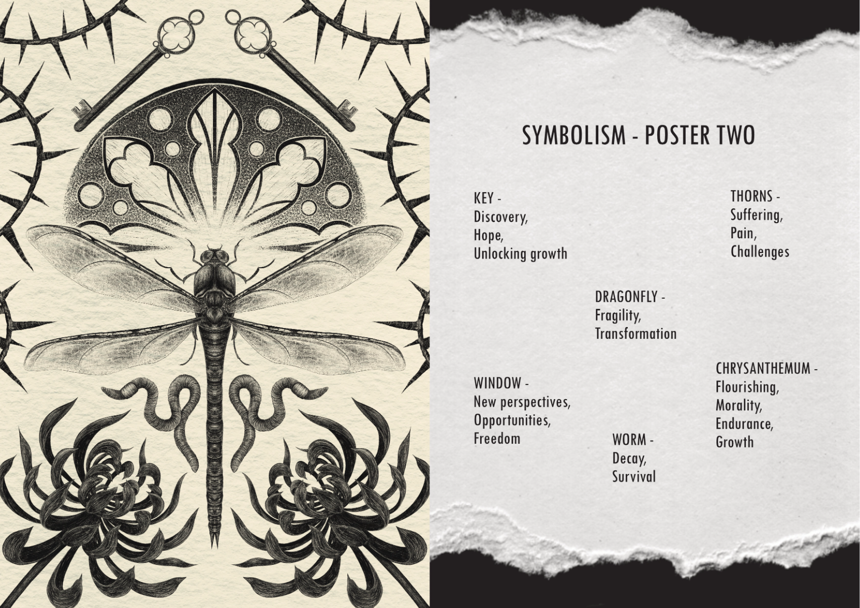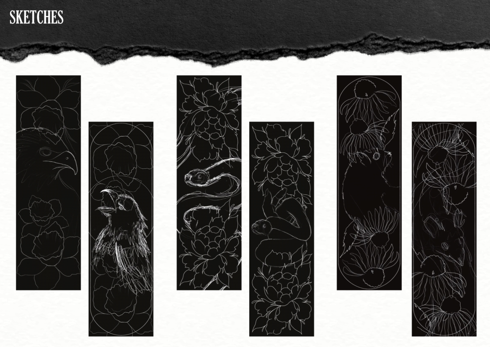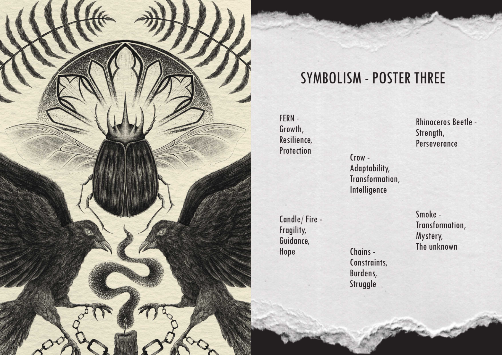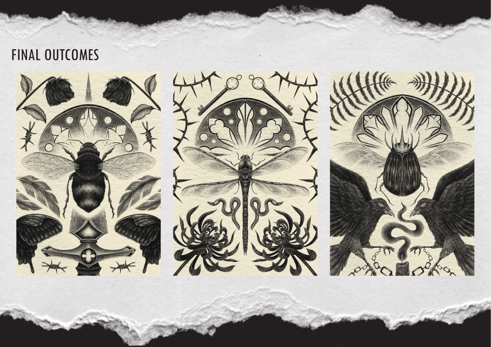 This project applies the concept of Memento mori (Latin for remember you must die) through symbolism and intricate illustrations over a series of skateboard designs. This concept is represented by the food chain, a portrayal of predator and prey across the three boards, from bird, to snake, to rodent. Each piece explores symbolism, intertwining animals and flowers representing strength, transformation and resilience. This work stands as visual representation of my artistic journey, a cycle of chapters ending and new beginnings.