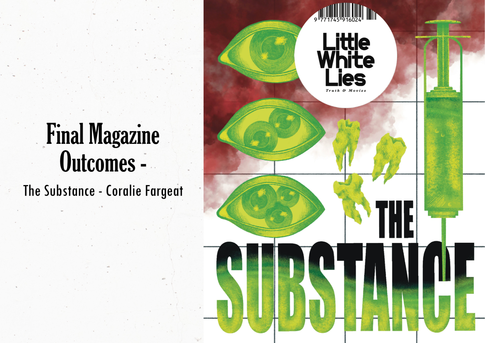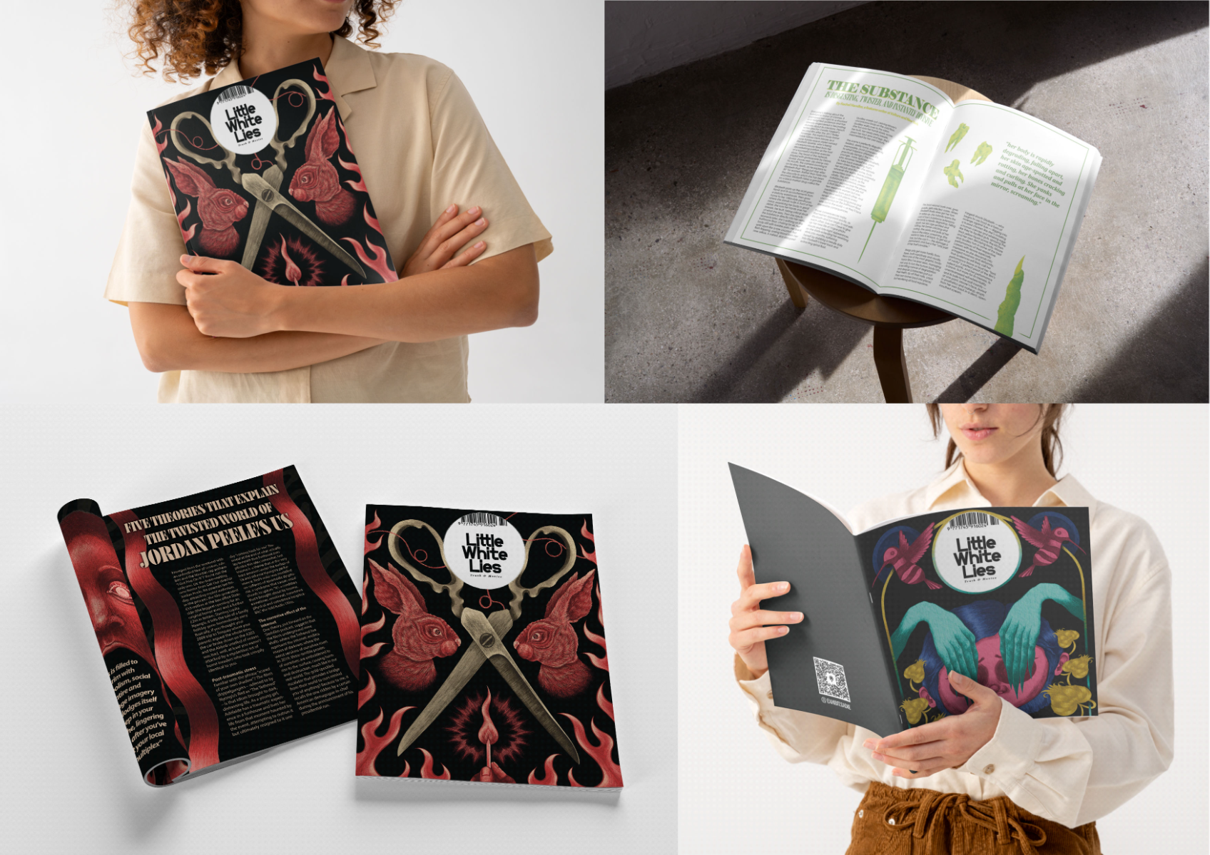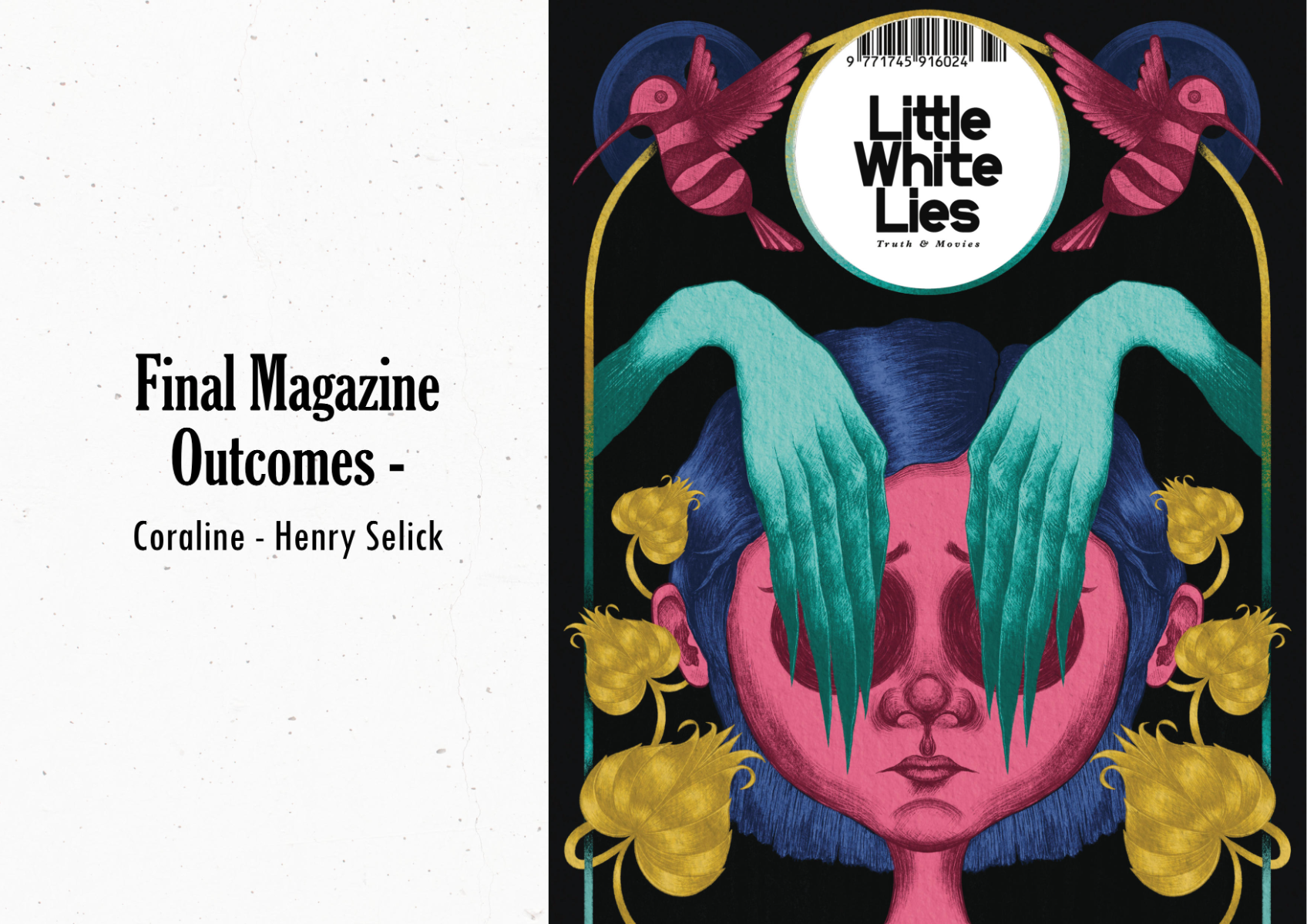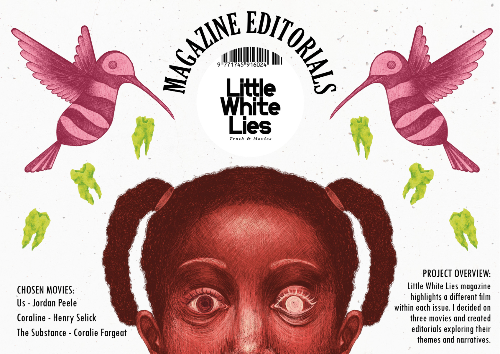 This project illustrates concepts for Little White Lies, a magazine that highlights a different film in each issue with a consistent colour pallet throughout. Exploring Coraline, Us, and The Substance, the illustrations interpret their visual language, themes and aesthetic identity, brought to life in magazine editorials and film posters that reflect their storytelling.