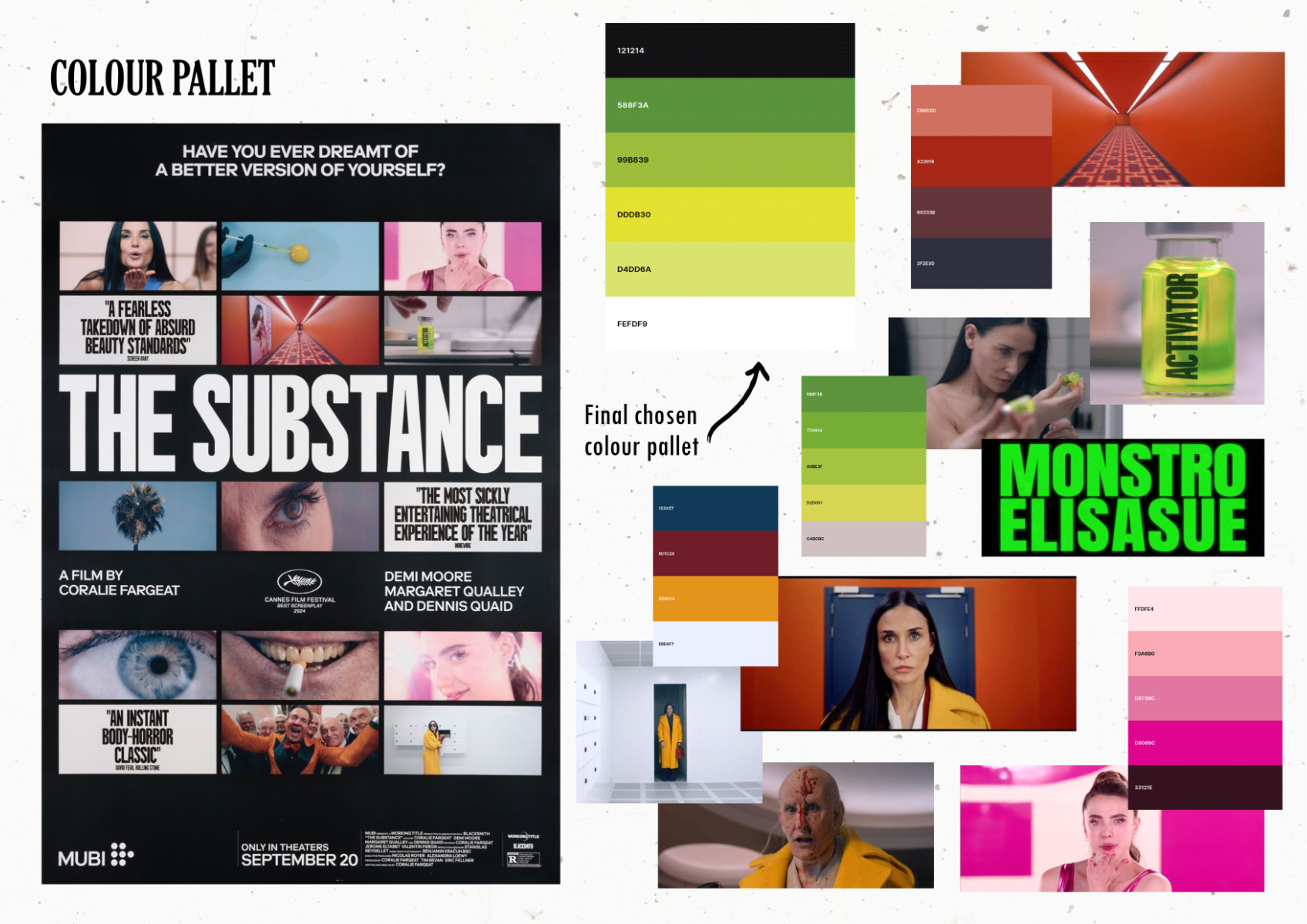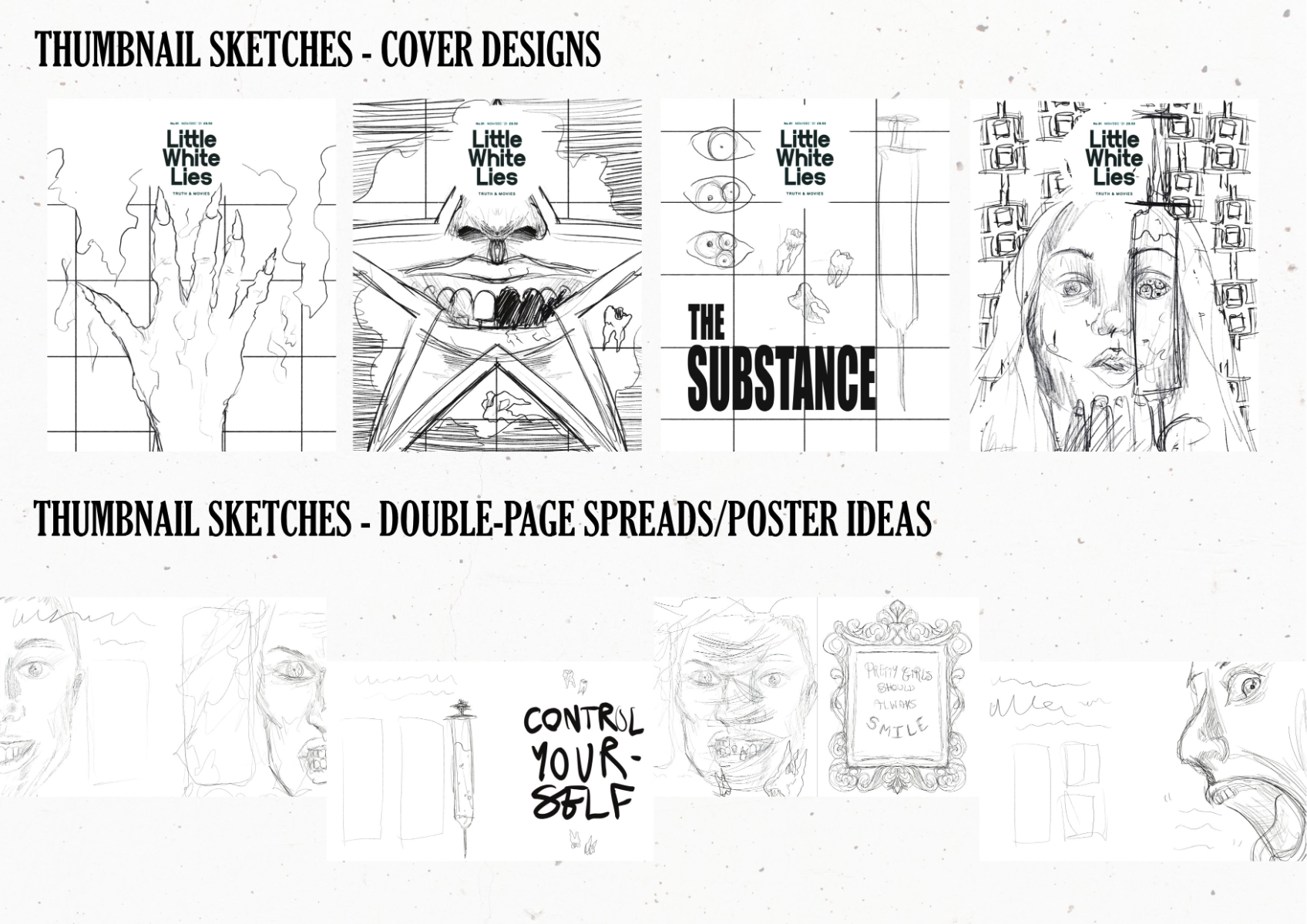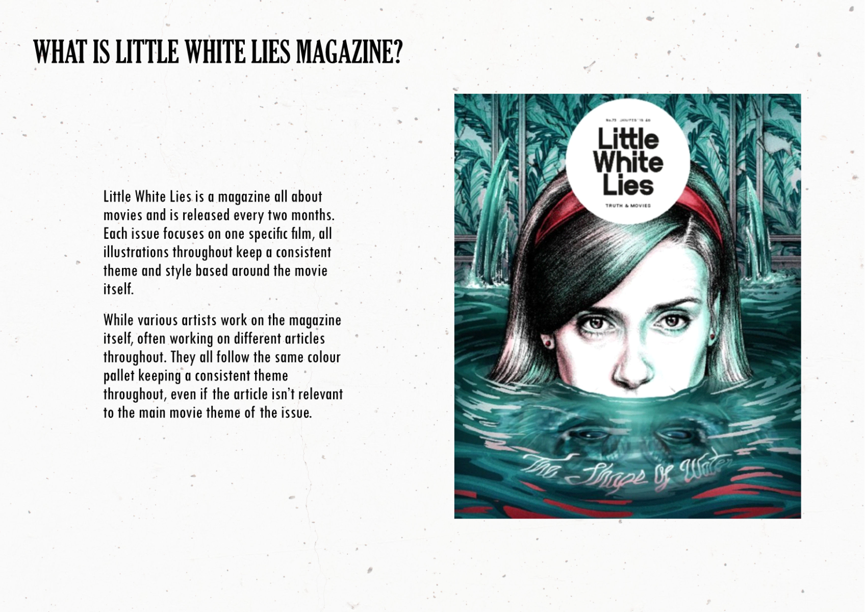 This project illustrates concepts for Little White Lies, a magazine that highlights a different film in each issue with a consistent colour pallet throughout. Exploring Coraline, Us, and The Substance, the illustrations interpret their visual language, themes and aesthetic identity, brought to life in magazine editorials and film posters that reflect their storytelling.