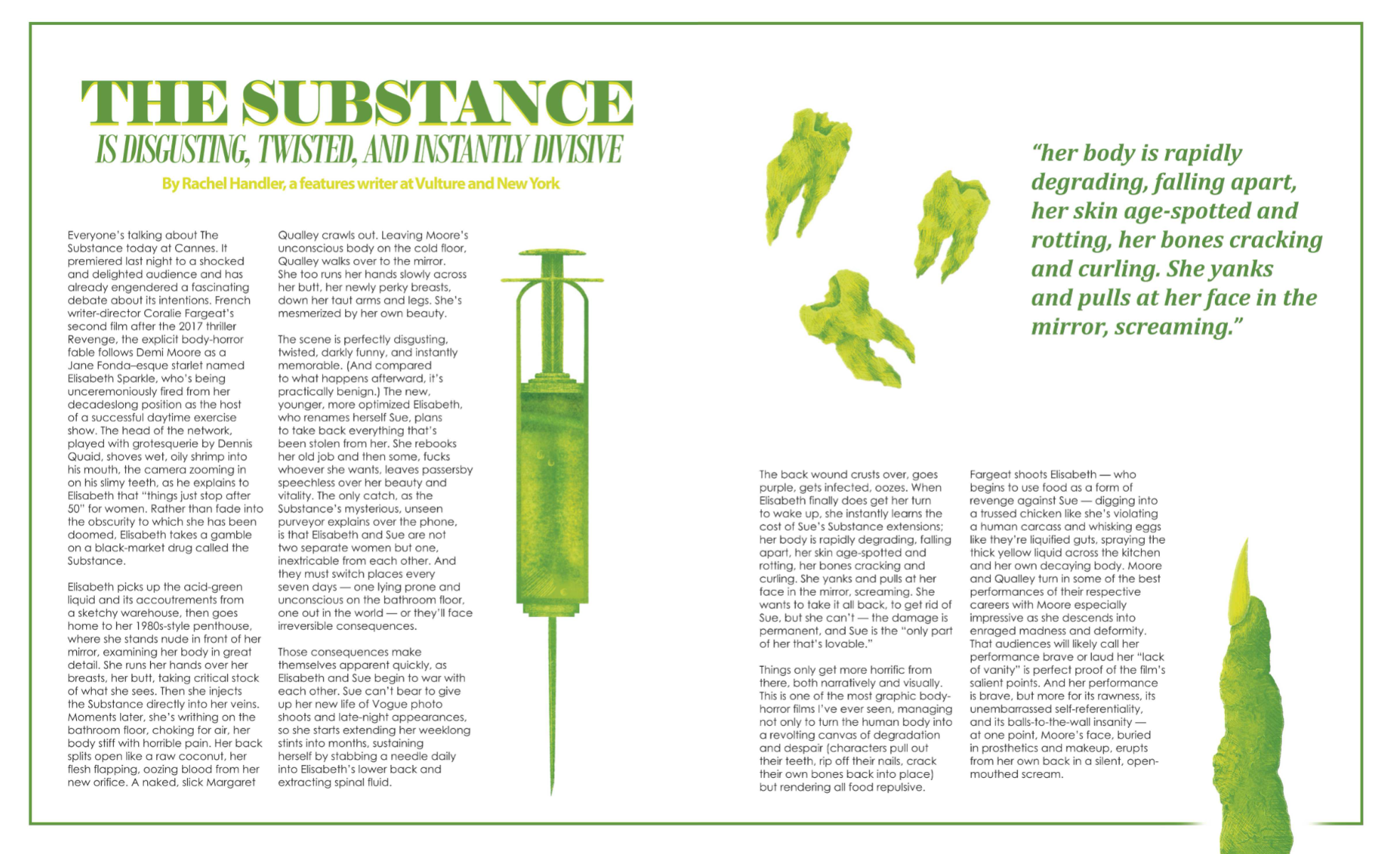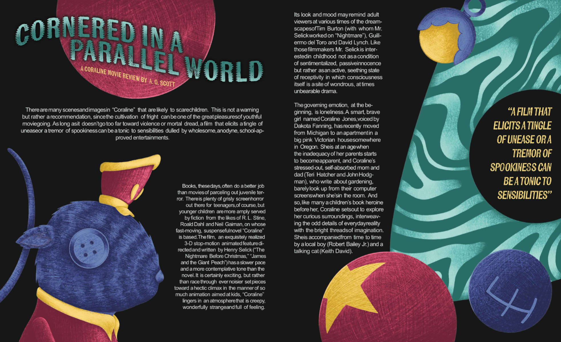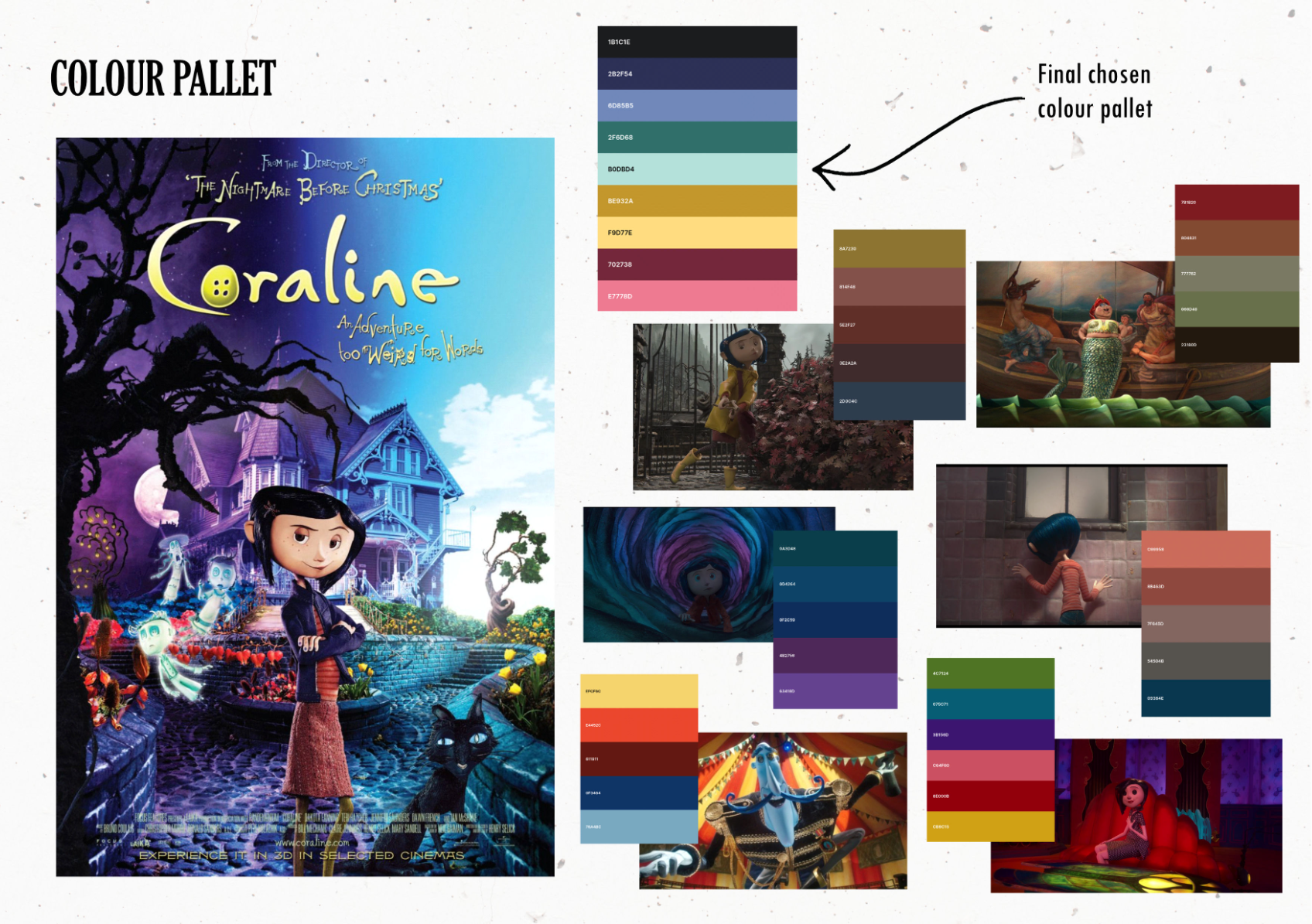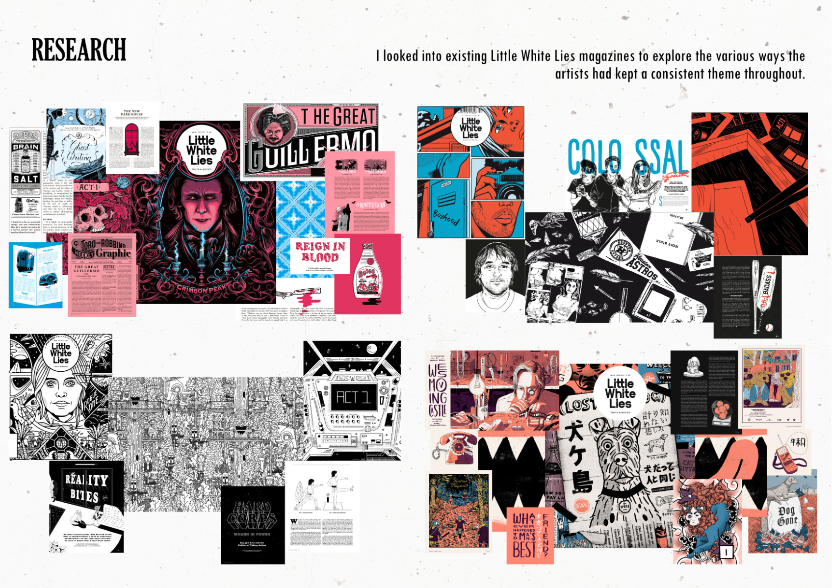 This project illustrates concepts for Little White Lies, a magazine that highlights a different film in each issue with a consistent colour pallet throughout. Exploring Coraline, Us, and The Substance, the illustrations interpret their visual language, themes and aesthetic identity, brought to life in magazine editorials and film posters that reflect their storytelling.