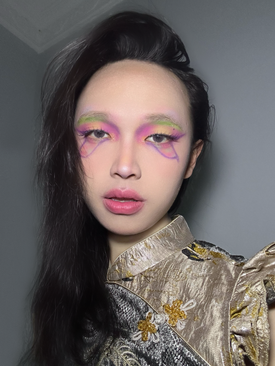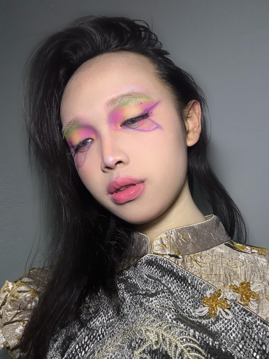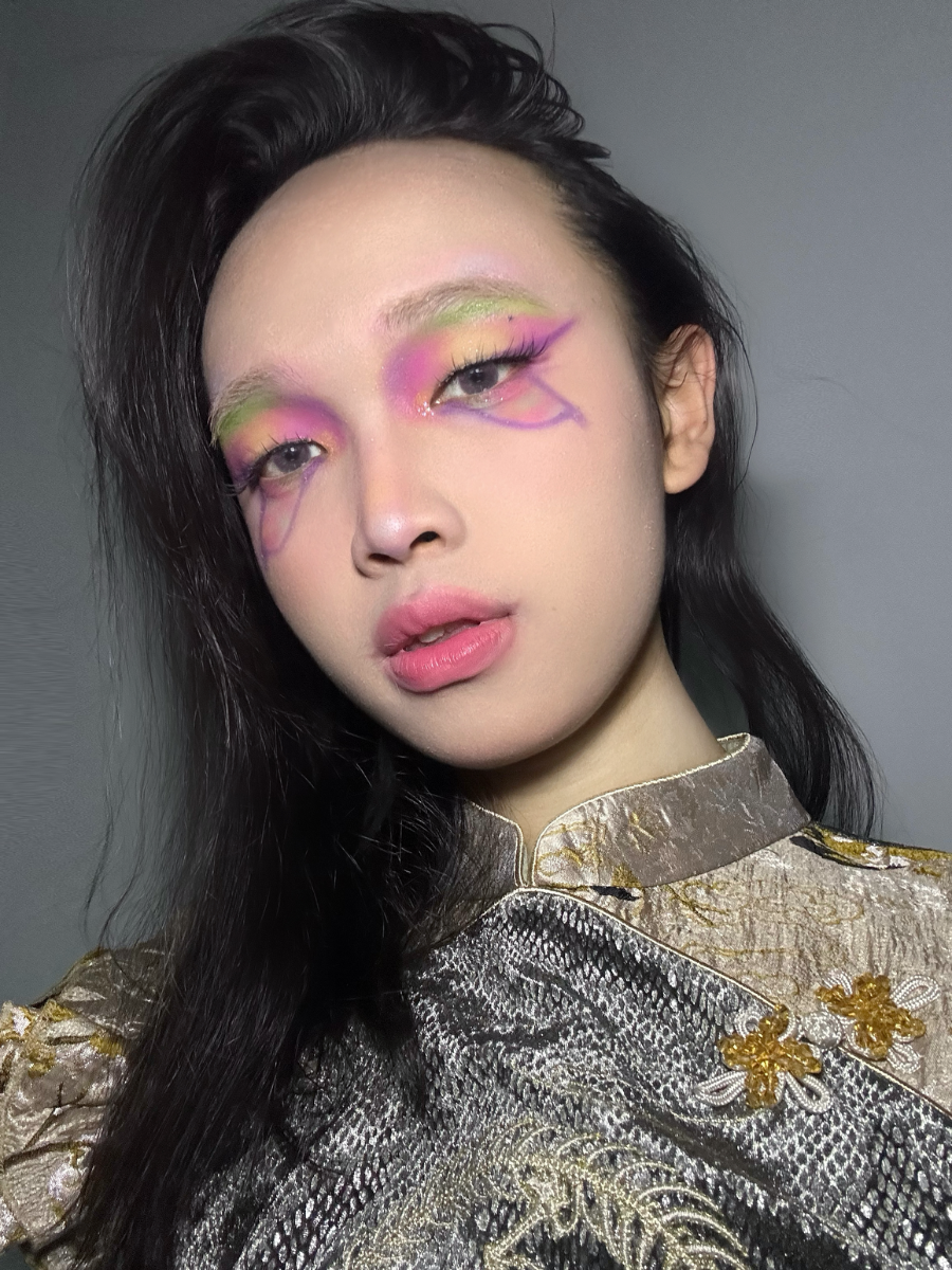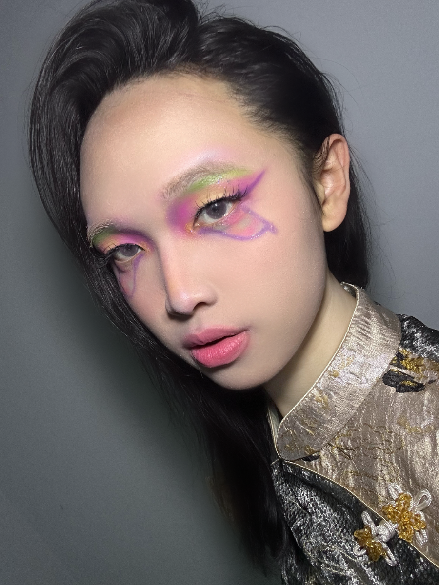 Like a flower blooming in the night. Pink and purple intertwine to form its heart, while a touch of soft green rests lightly upon the brow bone. Veins trace their way along the corners of the eyes. Gentle, yet not fragile.
