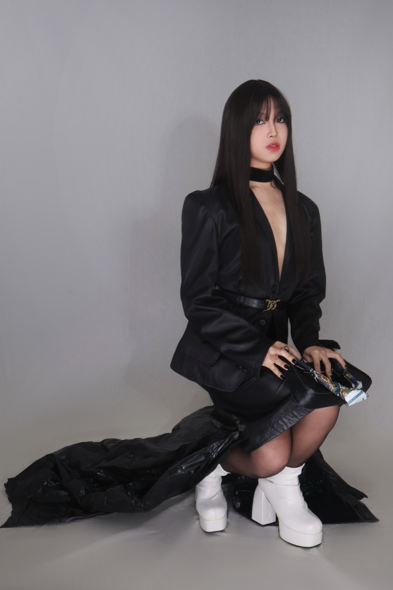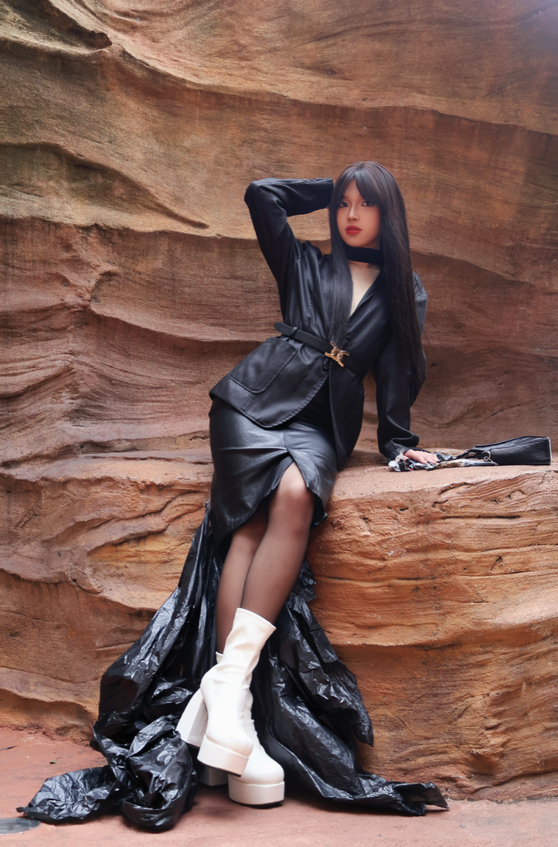 An exploration of silhouette tension — masculine tailoring meets sculpted femininity. The contrast of black leather and white platform boots disrupts tradition while maintaining balance. Control, contrast, confidence.