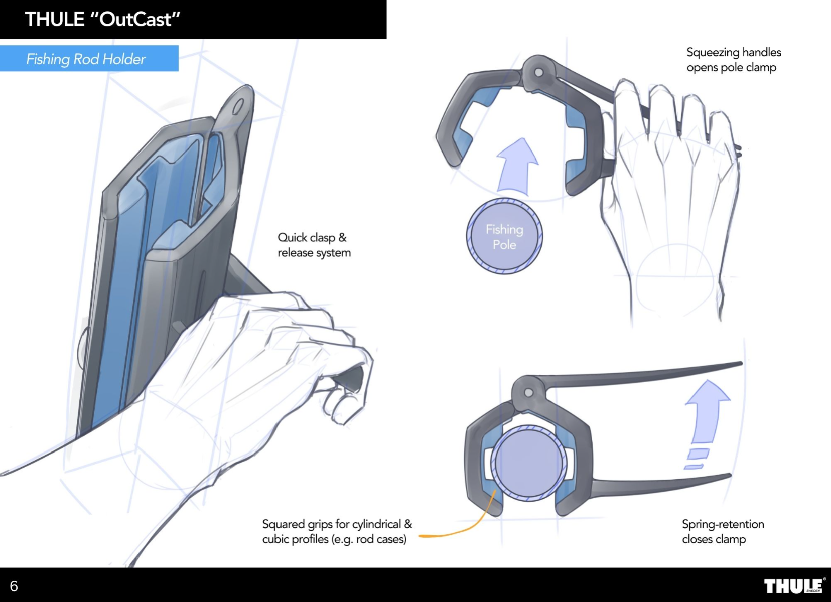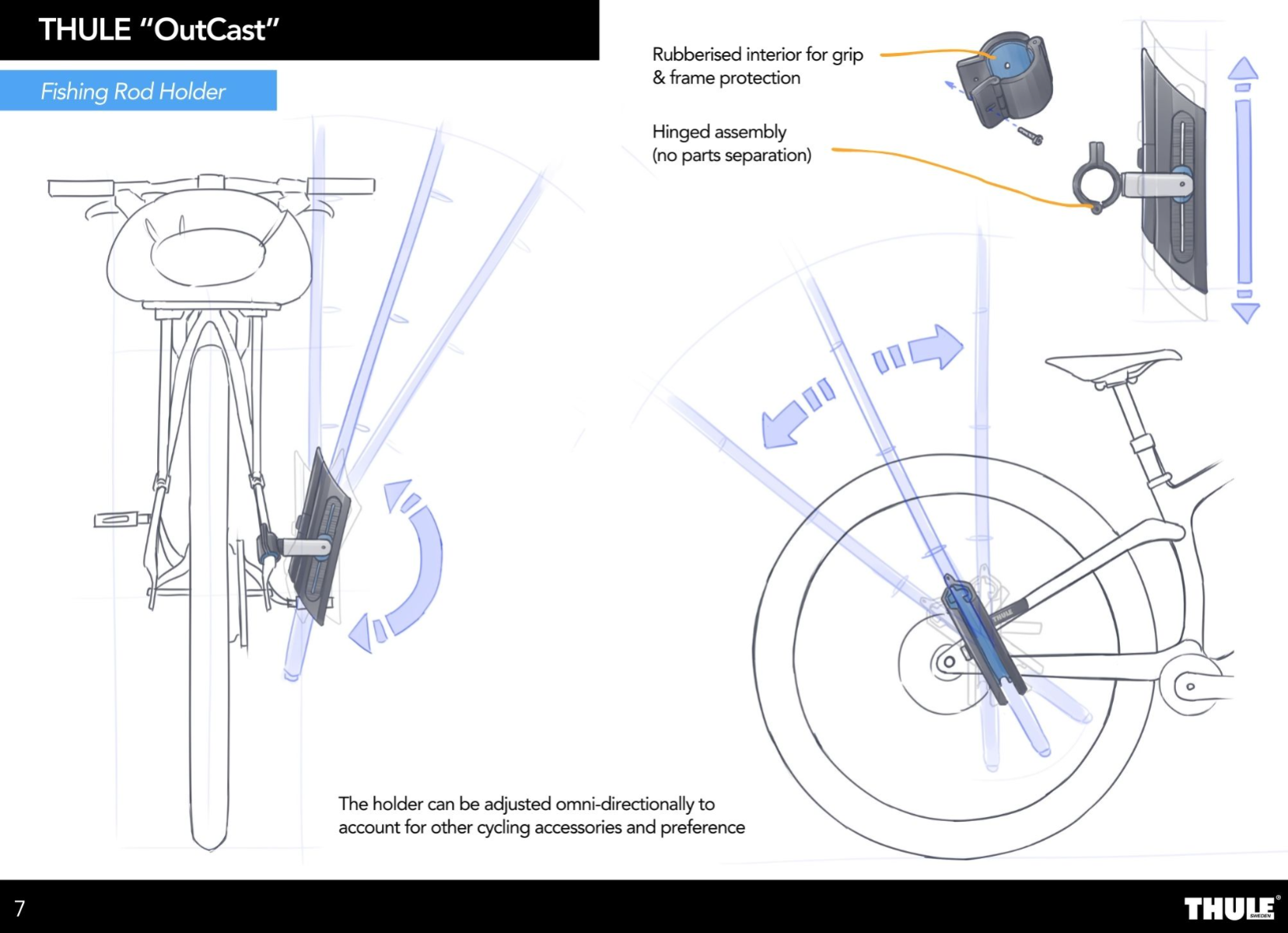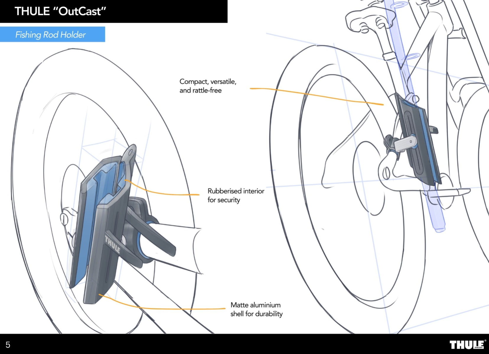 Concept for a quick-release, premium rod holder for bike fishing. The Thule 'Outcast' aims to reduce the fuss of affixing and removing fishing gear, and is designed to be compatible with rods in and out of storage bags. This outcome was part of a rapid concept generation team project based on the design ethos of Thule - a high-end car/bike accessory brand.