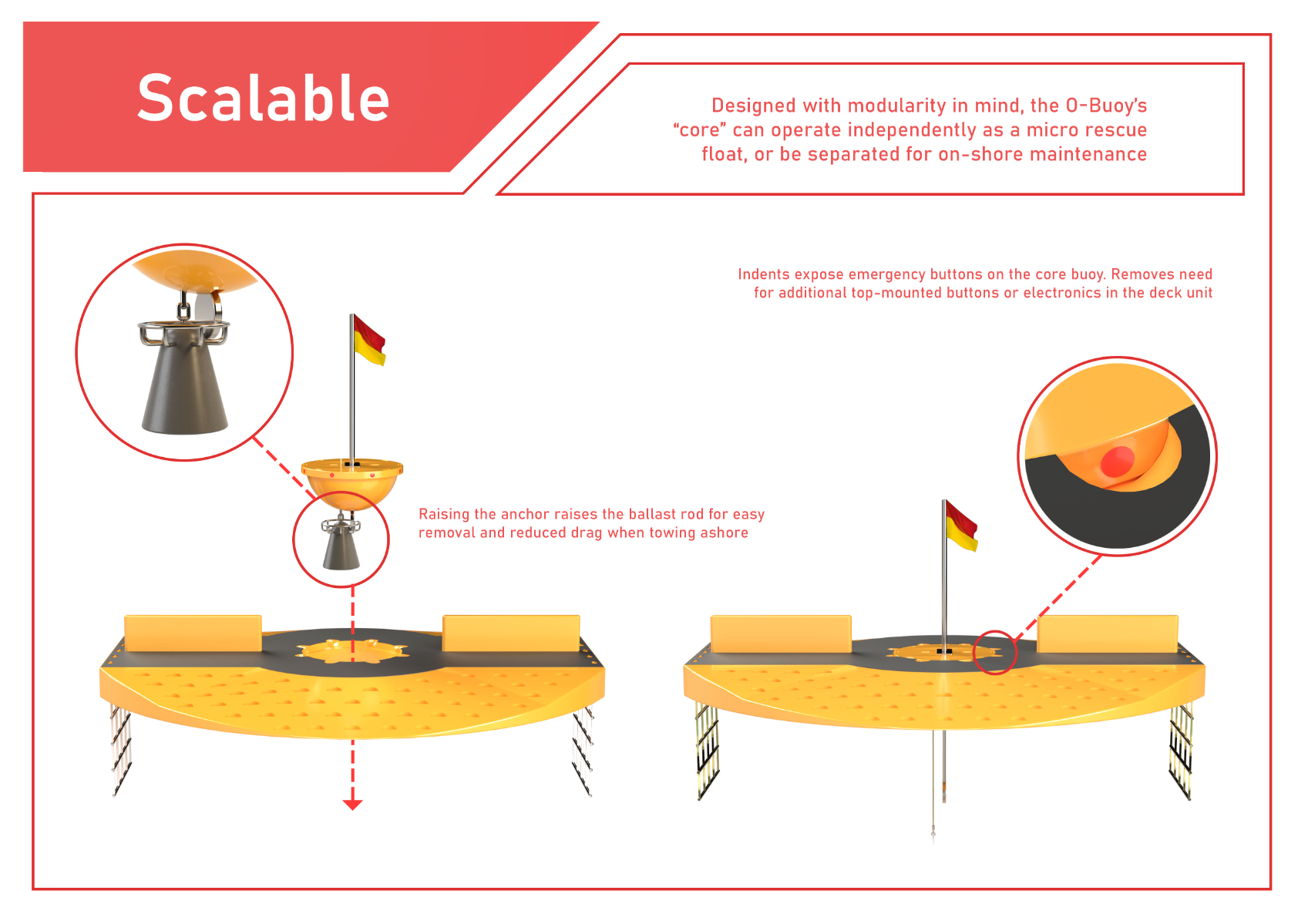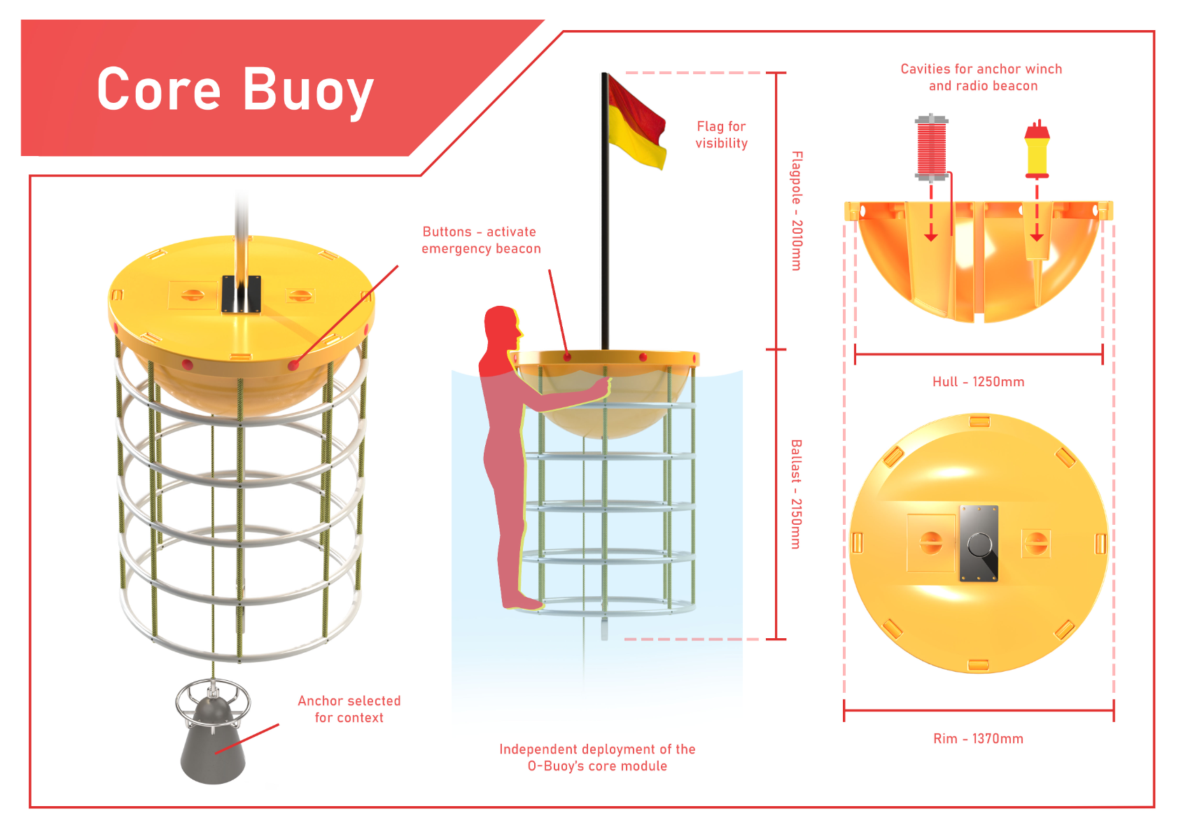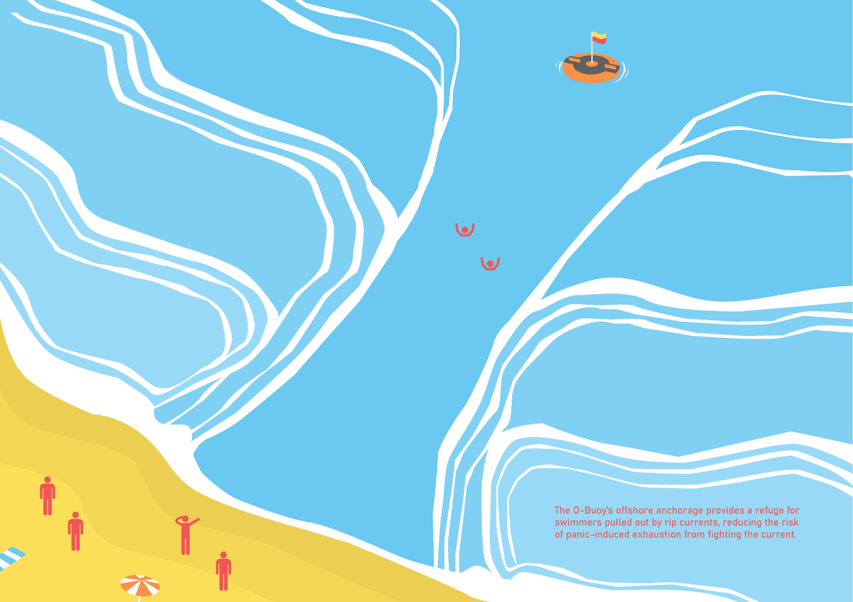 An emergency float intended for use at public beaches. The O-buoy is anchored offshore to accommodate swimmers dragged out by rip currents, as many drowning incidents occur due to exhaustion while trying to swim back to shore. The O-buoy provides a platform to board and signal surf lifesaving services for help. The design is modular and expandable, and built with repairability in mind. The body is constructed with rotationally-moulded HDPE, 316 steel, and hemp rope - minimally ecotoxic and fully recyclable. This project won 1st prize in the 2024 ARMA Student Design Competition, and received a finalist position in the 2025 New Zealand Best Awards.