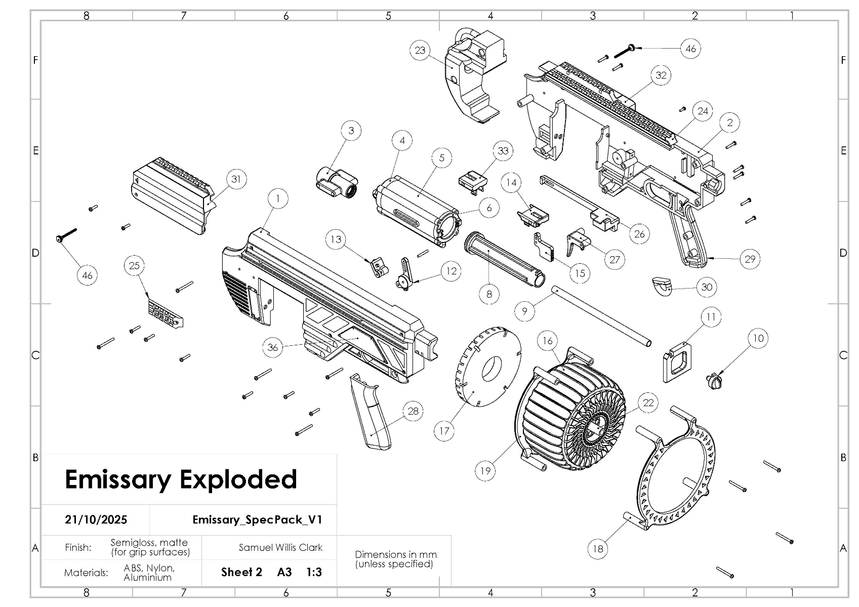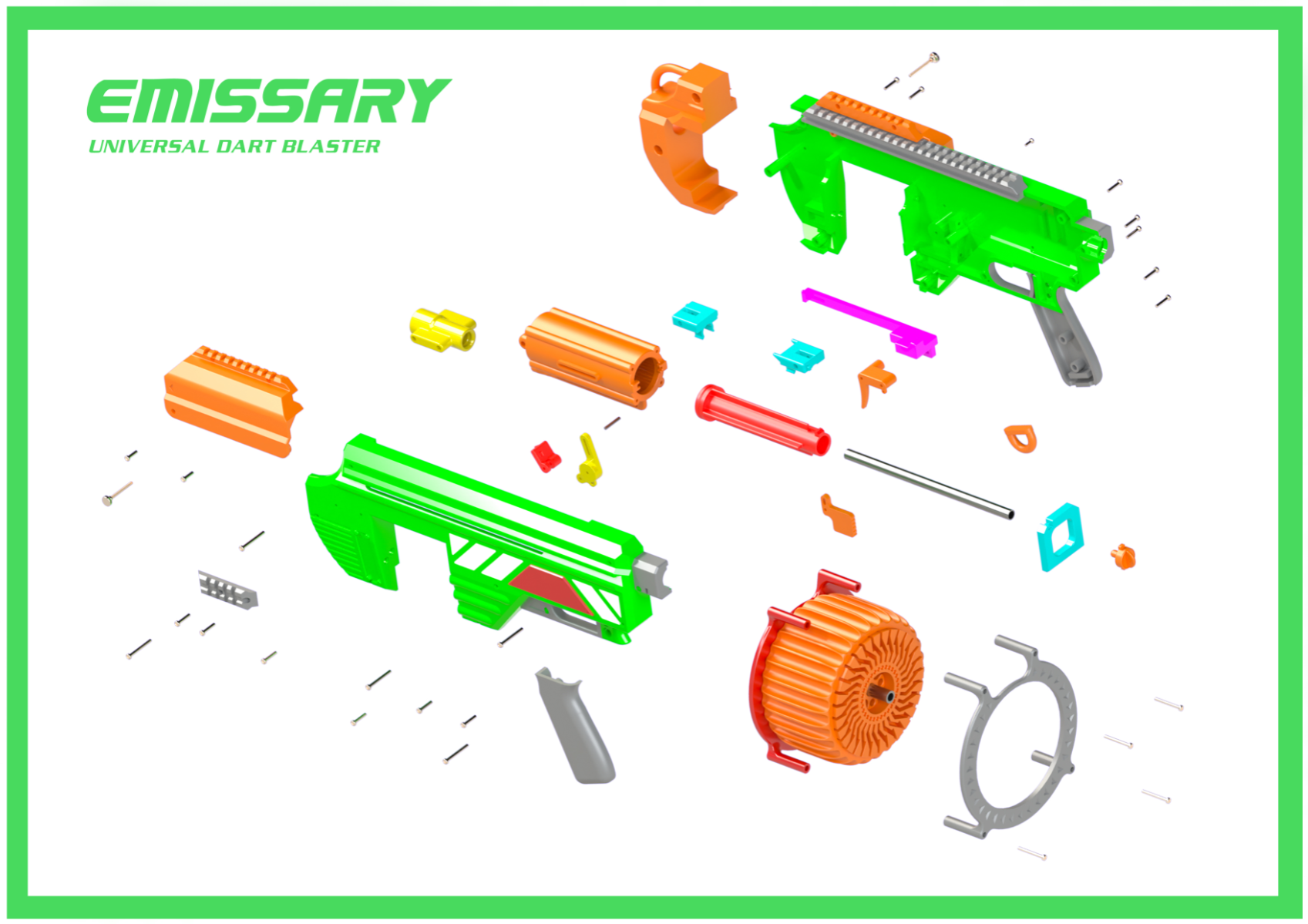This project aimed to design a quality, entry-level toy blaster that is retail safe in Australasia, while being fun and accessible for kids, adults, and pro hobbyists. Sports like airsoft and paintball are fun, but prohibitive entry costs and age restrictions can be discouraging. ‘Dartsoft’ – or ‘Nerf’ – is a great alternative, being cheaper and more readily available. However, the dartsoft blasters (or ‘guns’) available in Australasia are limited in terms of scalability and compatibility with upgrades, forcing local hobbyists to source equipment internationally for themselves and their clubs. Alternative products made for Australasia could help the hobby & sport tremendously. My prototype was developed through extensive research and troubleshooting - from surveys assessing blaster silhouettes for safety, to dozens of digital and physical prototypes of the blaster’s internal mechanisms. While early in development, the Emissary aims to fill the void in the Australasian market, making dartsoft more accessible for everyone.