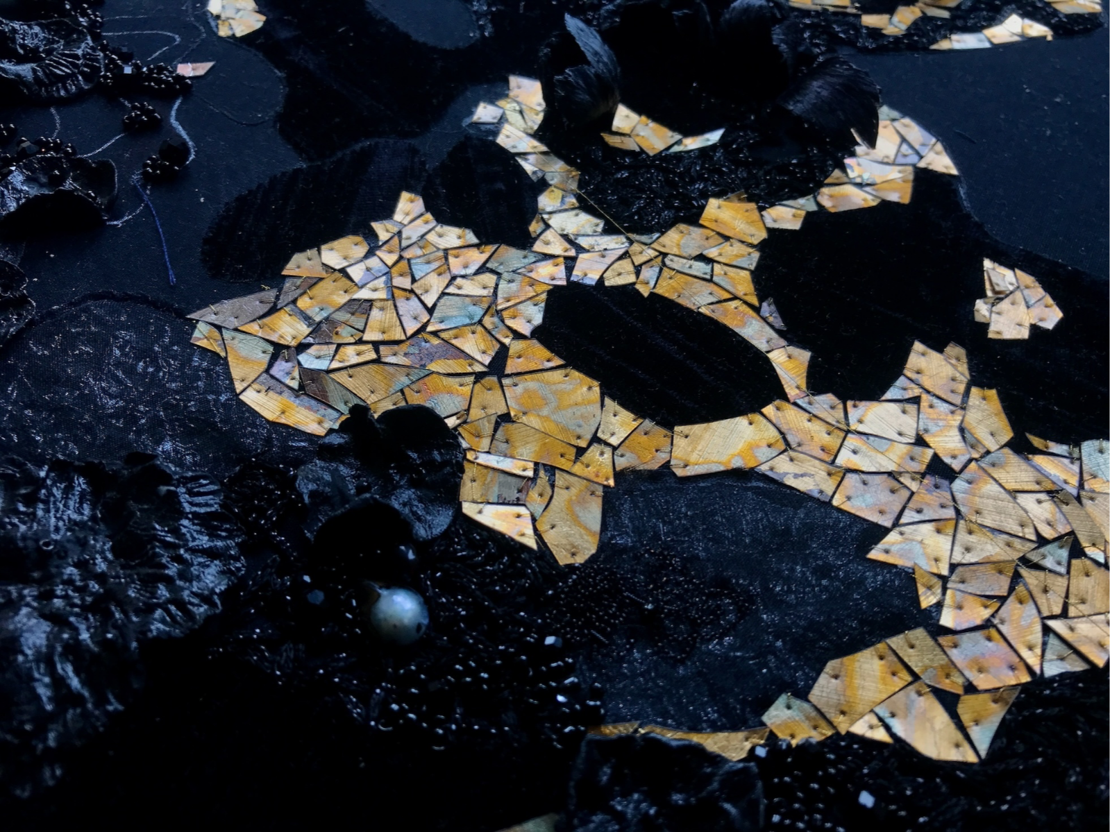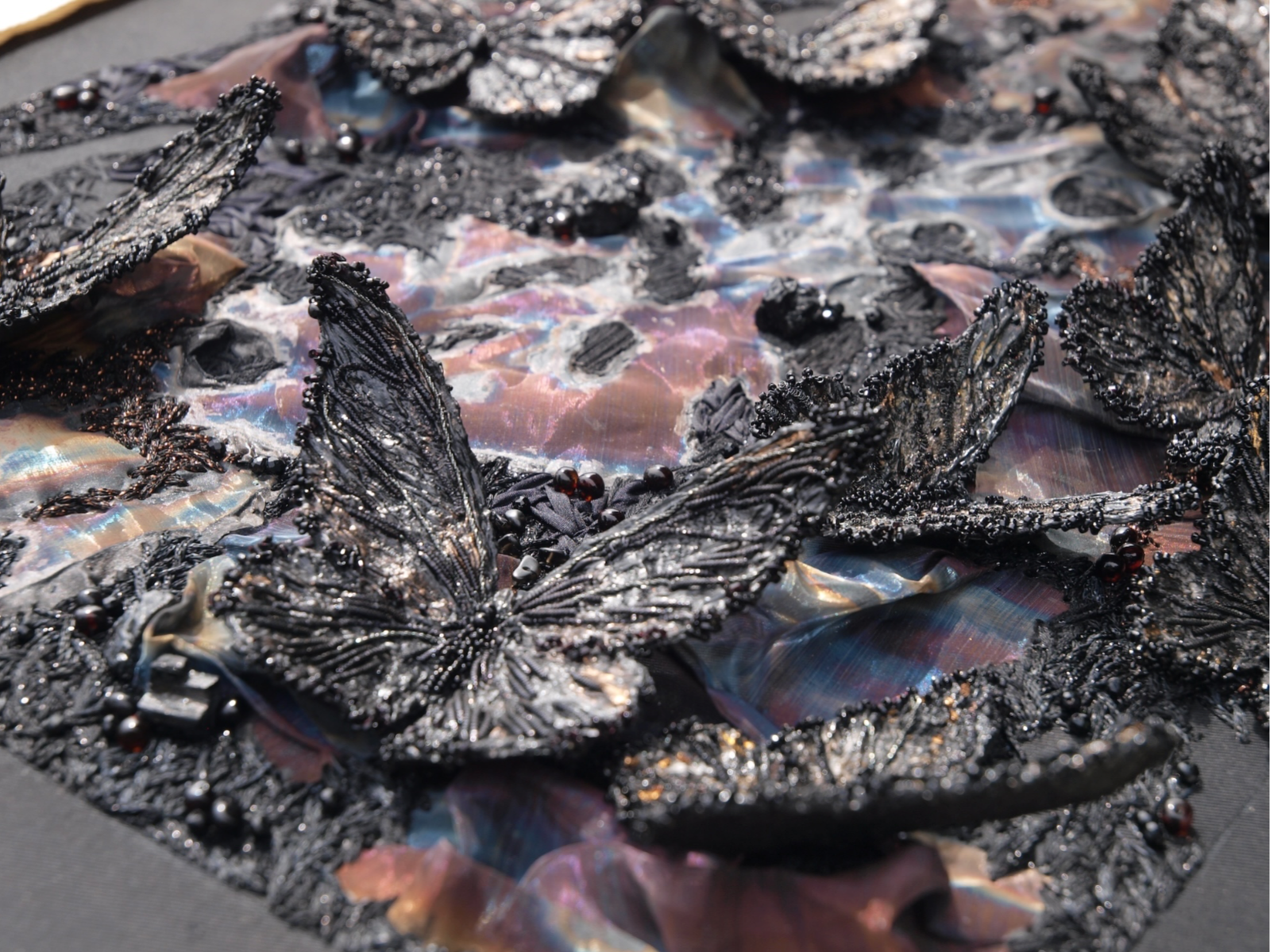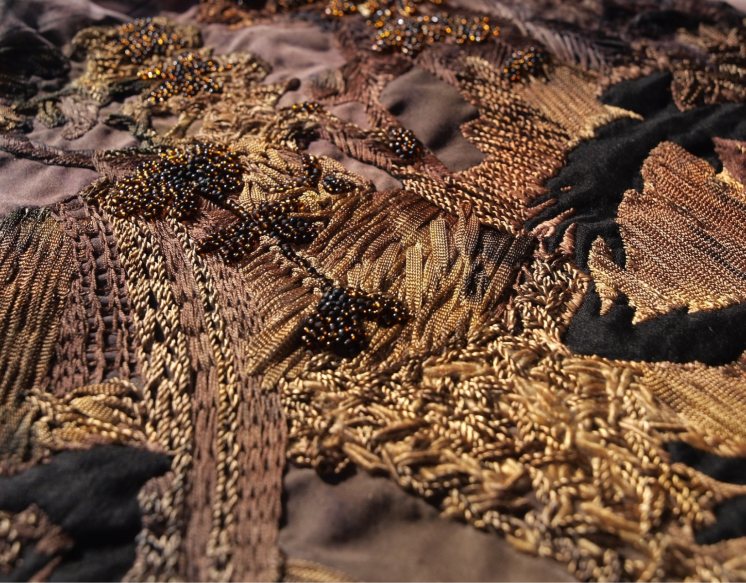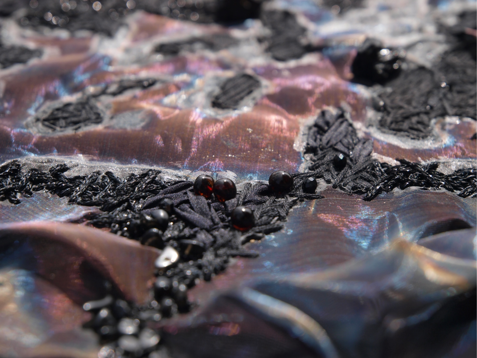 Maleficium, the latest work by hand embroiderer Severina Seidl, explores themes of despair and hope, inspired by Krabat, the novel by German author Otfried Preußler. A book that profoundly shaped her youth, it resonated with her as a hopeless romantic and daydreamer, drawn to melancholic narratives. Through her work, she weaves her own stories—tales of dark magic, death, and fear, counterbalanced by the redemptive power of love. Duality lies at the heart of Maleficium, where the mysterious, ominous presence of ravens contrasts with the ethereal delicacy of butterflies, set against abstract elements that embody the tension between darkness and lightness. Her research draws on diverse influences, including the haunting imagery of ravens by Japanese photographer Masahisa Fukase, the wire drawing of jeweller Huimin Zhang, and the organic textural techniques of embroidery artist Clémentine Brandibas. The Maison Margiela Artisanal Collection 2024 by John Galliano further informs her use of both unique and everyday materials, as well as her approach to narrative through textiles. Severina’s hand embroidery practice is defined by an innovative fusion of materials and techniques. In this piece she incorporates experimental goldwork embroidery—a technique traditionally associated with military uniforms— whilst bringing a contrasting texture with beading, painting, and stitching. Inspired by her fondness for the intricate still-life paintings of Rachel Ruysch, Severina layers textures and techniques with meticulous details to captivate the viewer, inviting close examination and discovery. A convergence of multiple ideas, Maleficium is a singular yet multifaceted piece. It unites a range of distinct techniques and narrative layers, allowing each viewer to discover and interpret their own story within it. The composition flows from lighter passages deep towards, impenetrable black-on-black sections, balancing abstraction and realism to evoke an emotional journey—from loneliness and emptiness to the quiet emergence of hope.