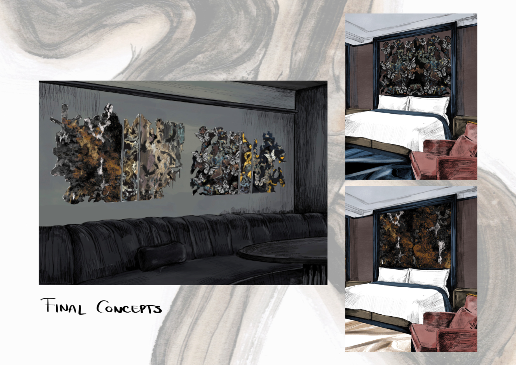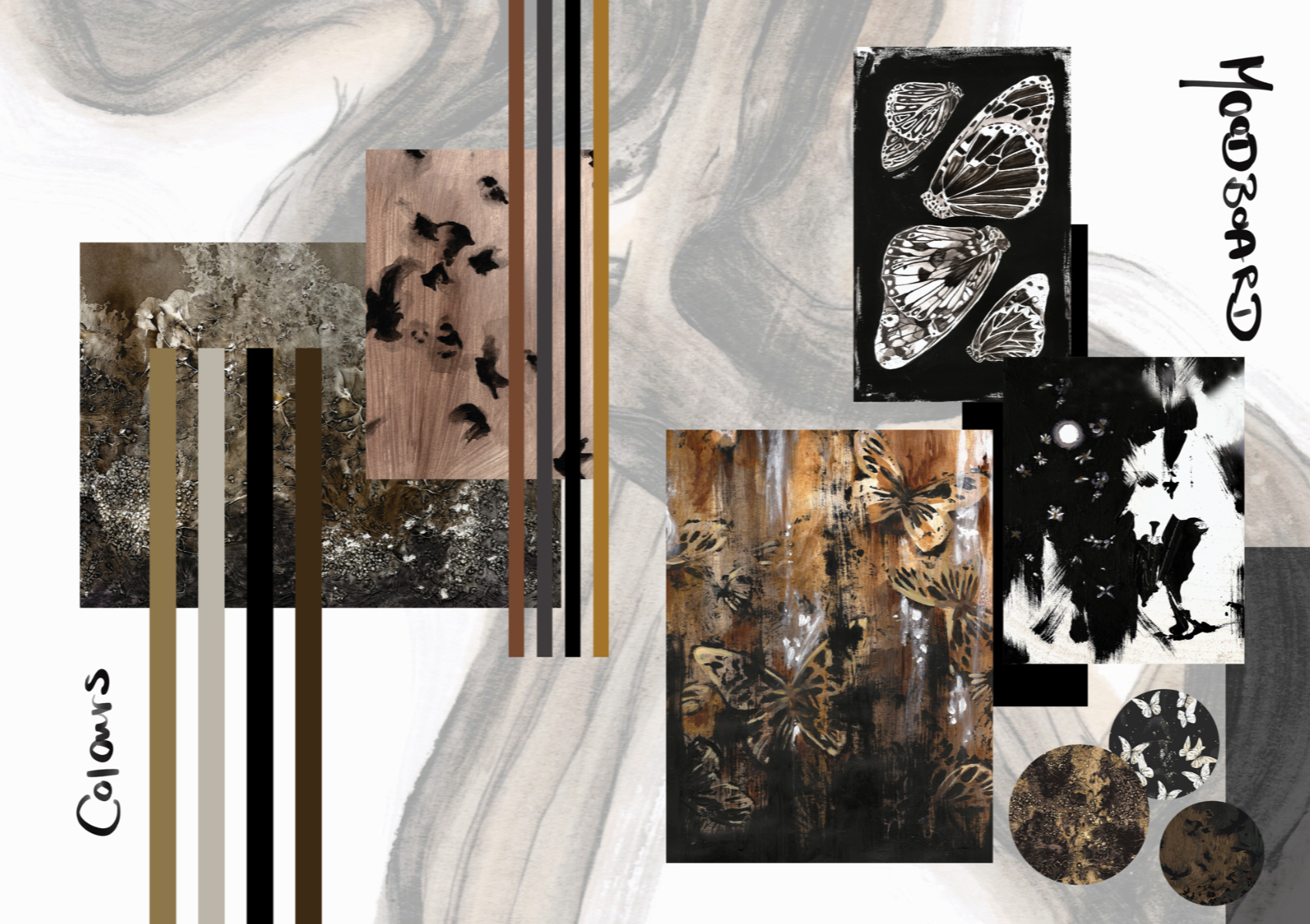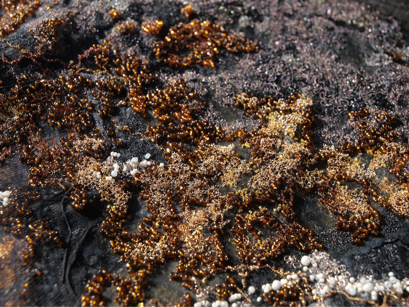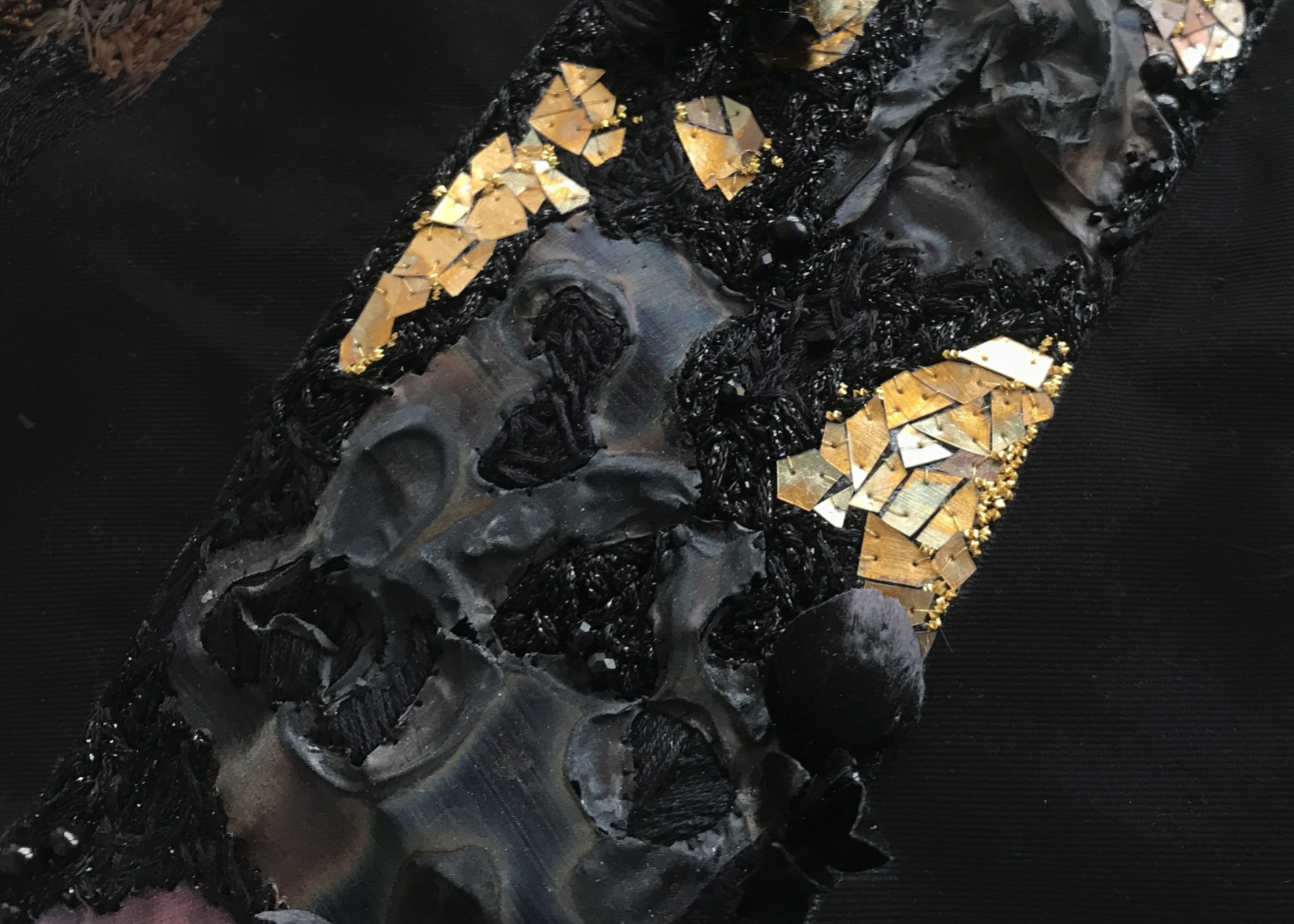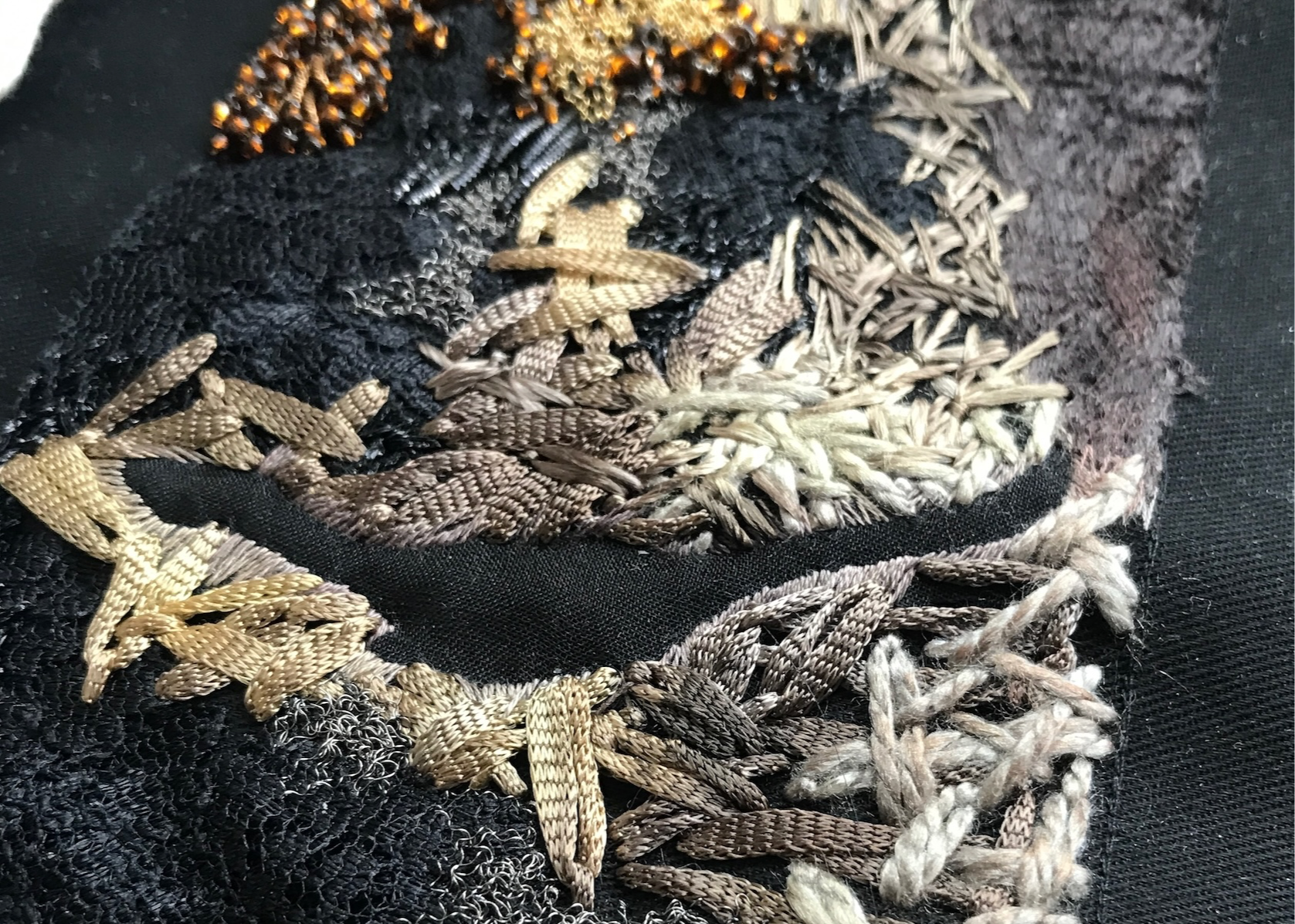 Maleficium, the latest work by hand embroiderer Severina Seidl, explores themes of despair and hope, inspired by Krabat, the novel by German author Otfried Preußler. A book that profoundly shaped her youth, it resonated with her as a hopeless romantic and daydreamer, drawn to melancholic narratives. Through her work, she weaves her own stories—tales of dark magic, death, and fear, counterbalanced by the redemptive power of love. Duality lies at the heart of Maleficium, where the mysterious, ominous presence of ravens contrasts with the ethereal delicacy of butterflies, set against abstract elements that embody the tension between darkness and lightness. Her research draws on diverse influences, including the haunting imagery of ravens by Japanese photographer Masahisa Fukase, the wire drawing of jeweller Huimin Zhang, and the organic textural techniques of embroidery artist Clémentine Brandibas. The Maison Margiela Artisanal Collection 2024 by John Galliano further informs her use of both unique and everyday materials, as well as her approach to narrative through textiles. Severina’s hand embroidery practice is defined by an innovative fusion of materials and techniques. In this piece she incorporates experimental goldwork embroidery—a technique traditionally associated with military uniforms— whilst bringing a contrasting texture with beading, painting, and stitching. Inspired by her fondness for the intricate still-life paintings of Rachel Ruysch, Severina layers textures and techniques with meticulous details to captivate the viewer, inviting close examination and discovery. A convergence of multiple ideas, Maleficium is a singular yet multifaceted piece. It unites a range of distinct techniques and narrative layers, allowing each viewer to discover and interpret their own story within it. The composition flows from lighter passages deep towards, impenetrable black-on-black sections, balancing abstraction and realism to evoke an emotional journey—from loneliness and emptiness to the quiet emergence of hope.
