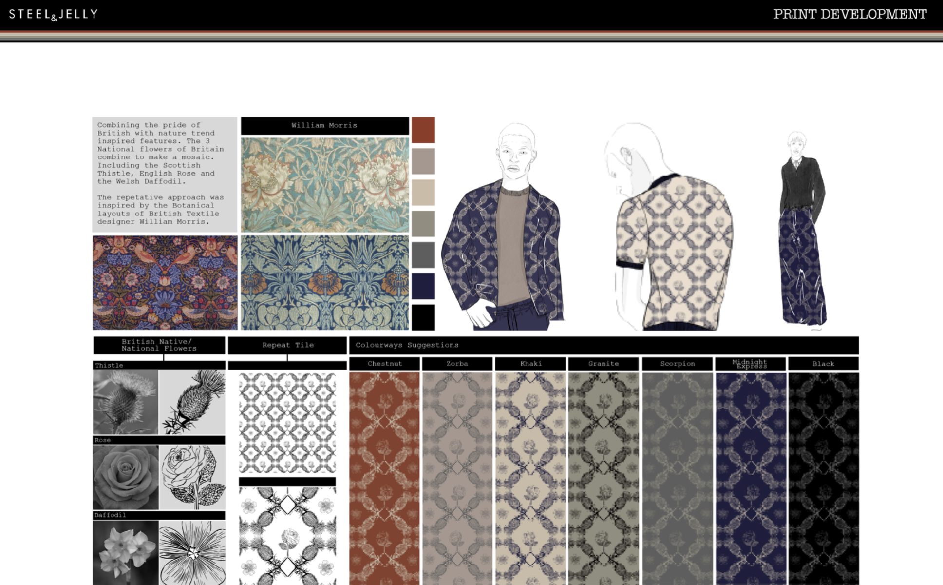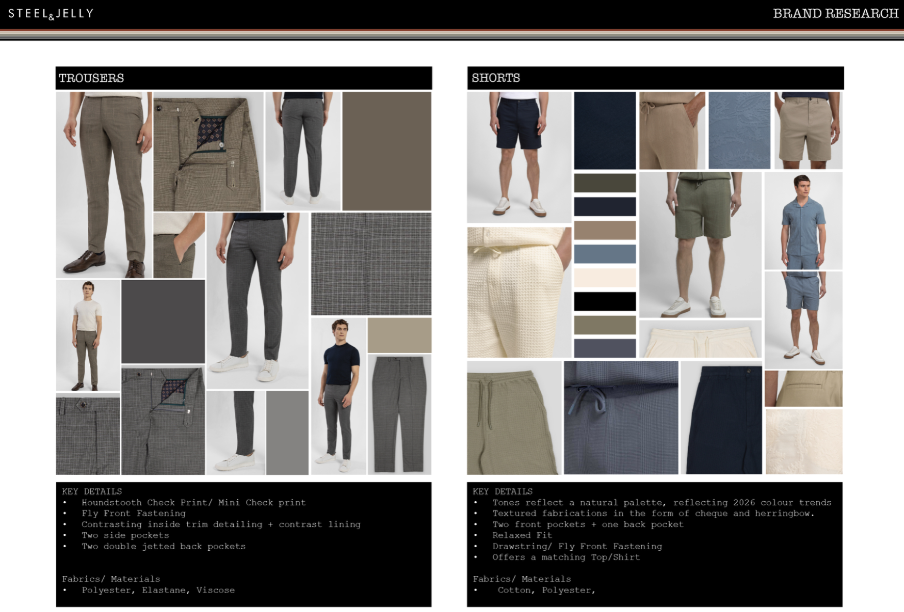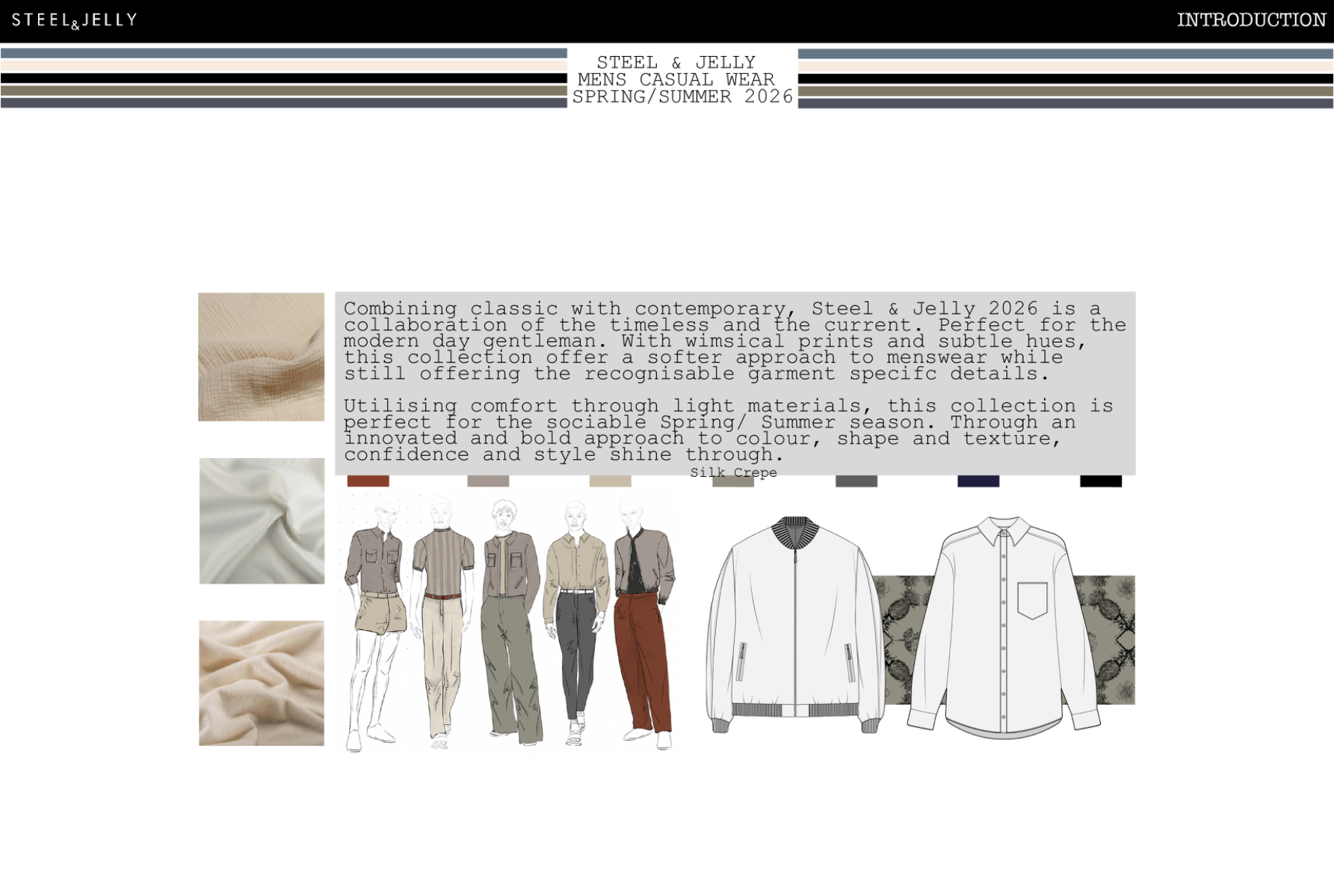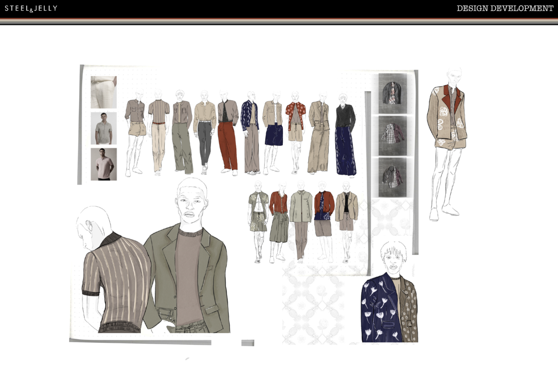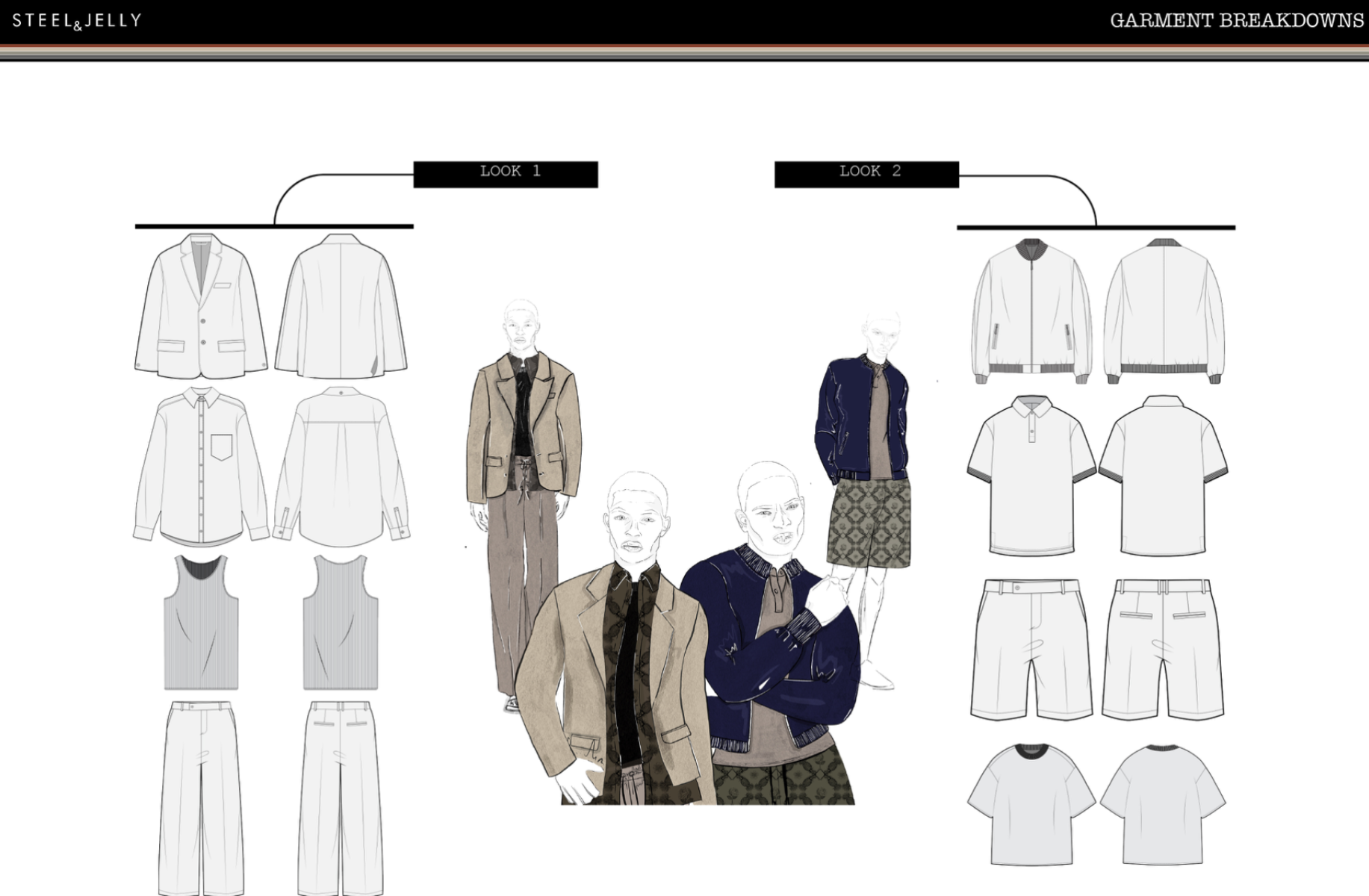 Design project for Menswear brand Steel & Jelly Project includes; - Brand research - Competitor - Customer Research - Trend Research - Fabric Sourcing - Design Development - Illustration - Technical Flats