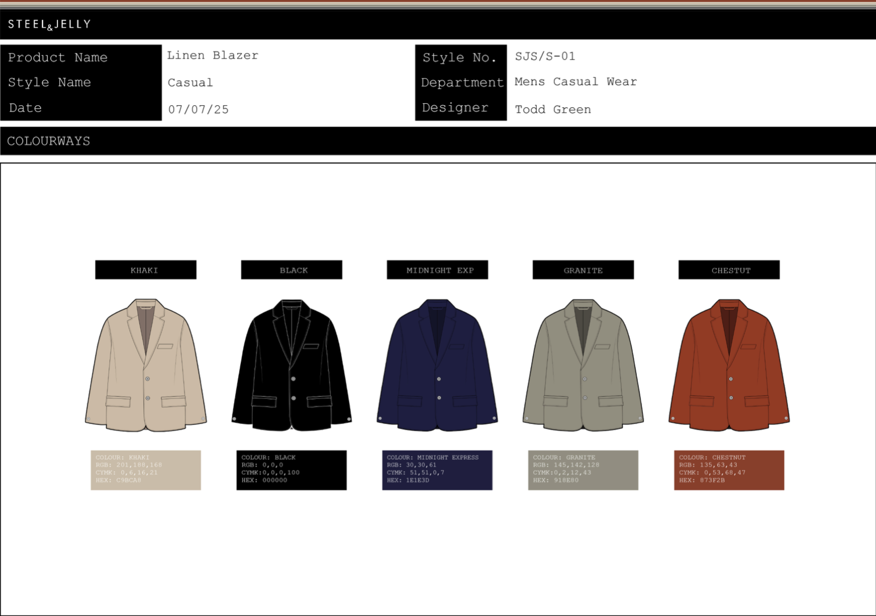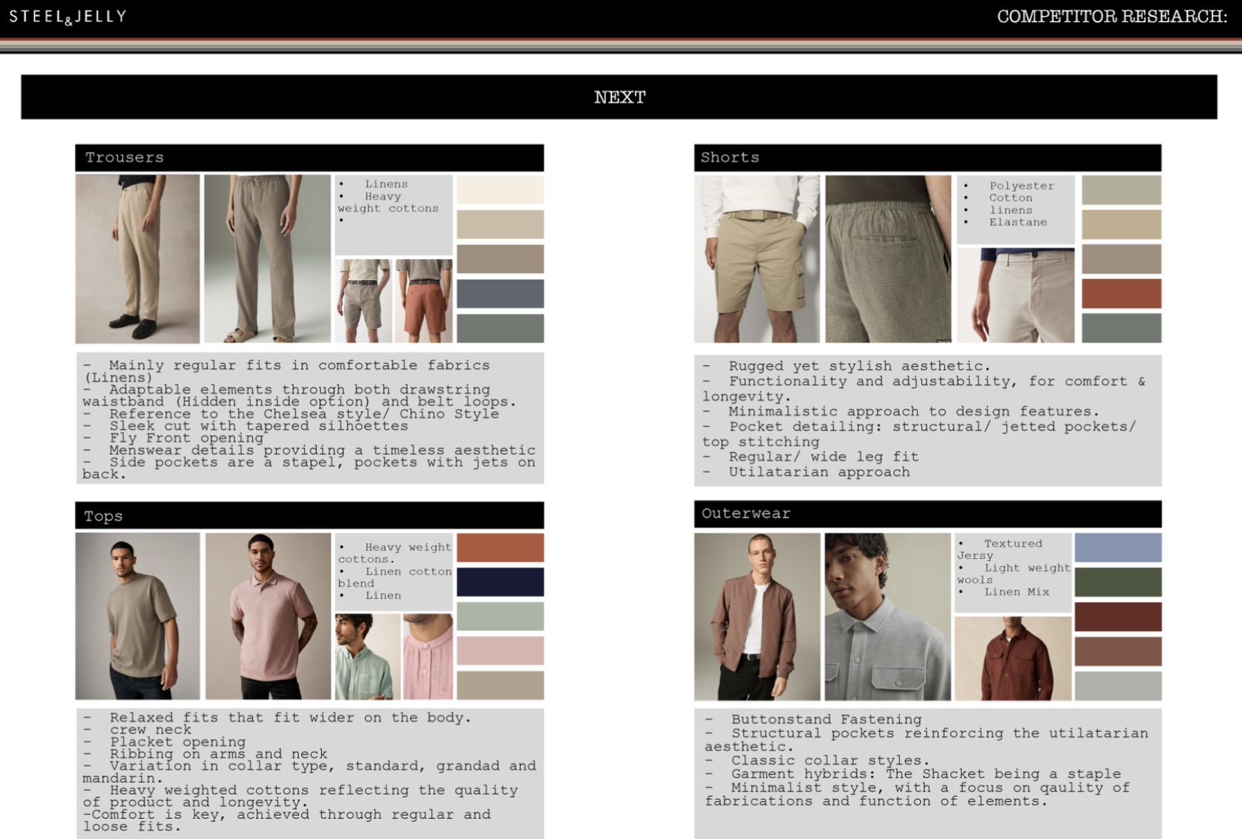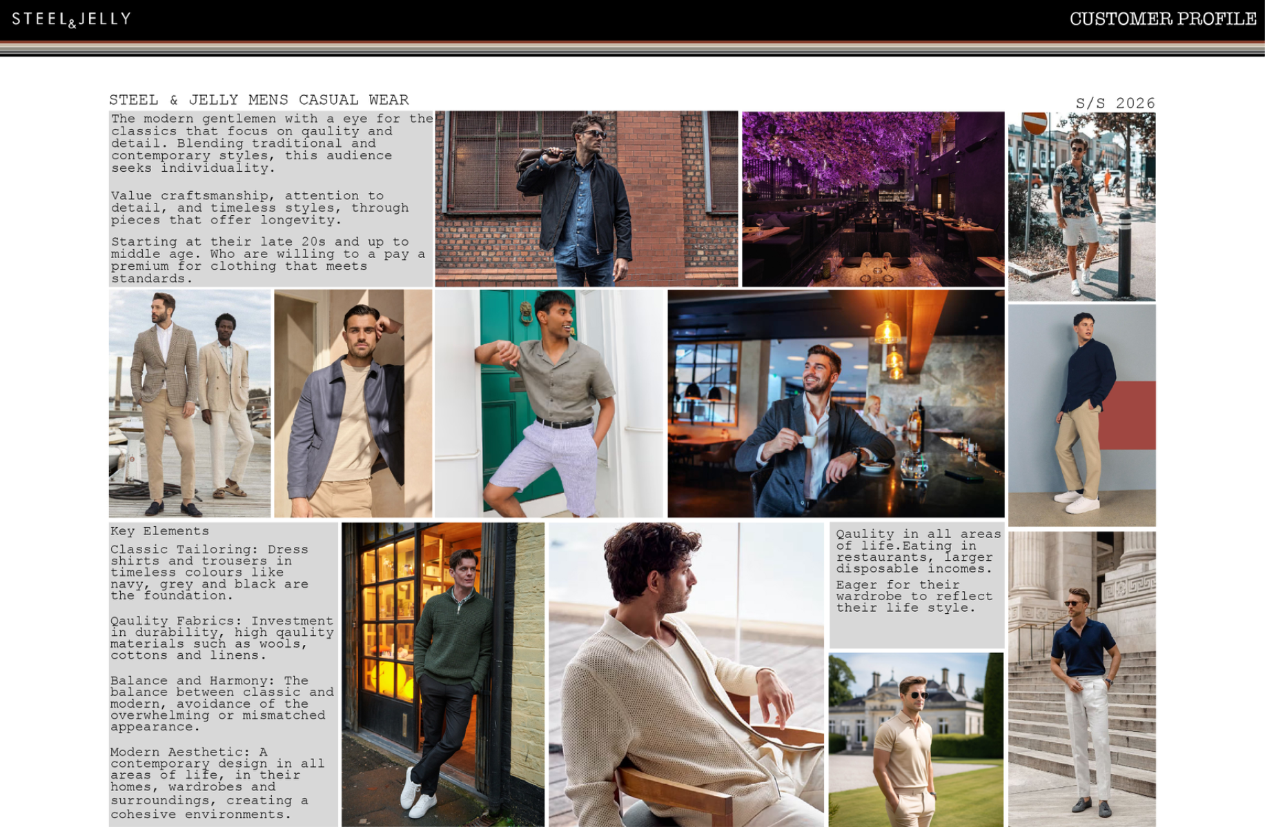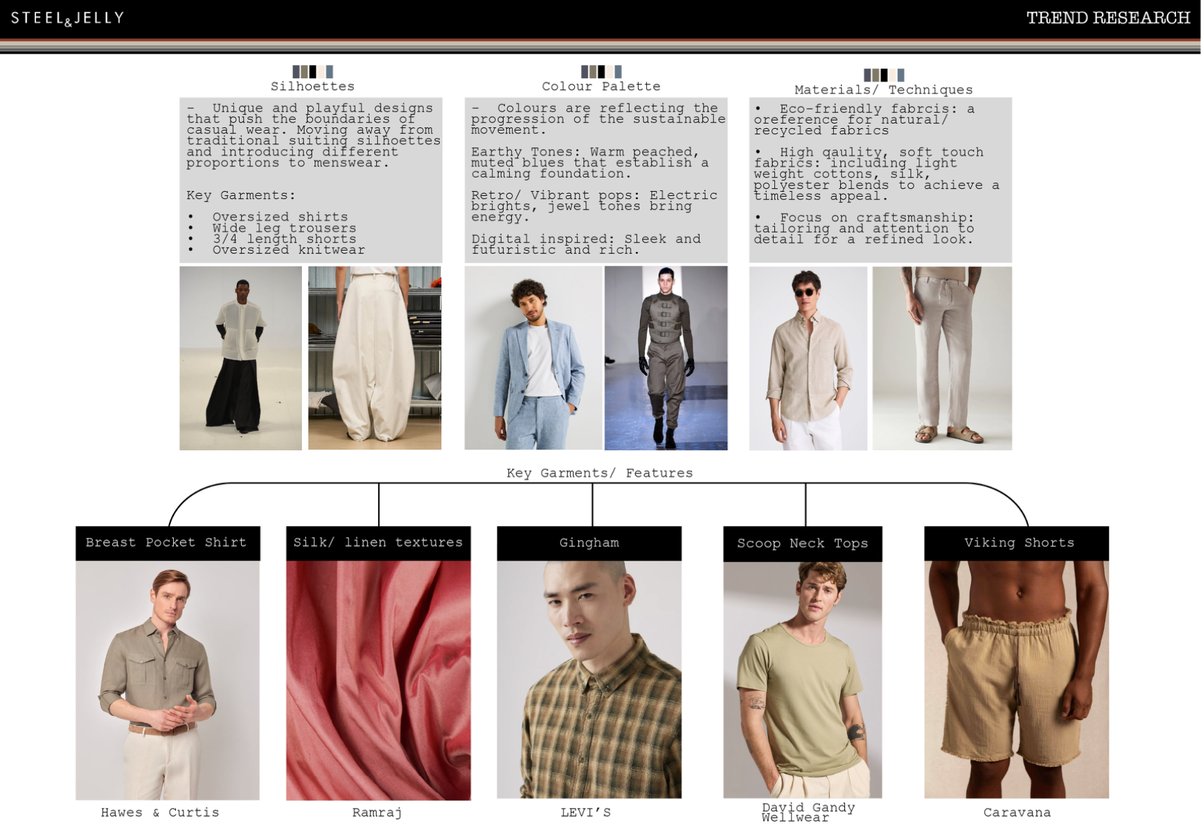 Design project for Menswear brand Steel & Jelly Project includes; - Brand research - Competitor - Customer Research - Trend Research - Fabric Sourcing - Design Development - Illustration - Technical Flats
