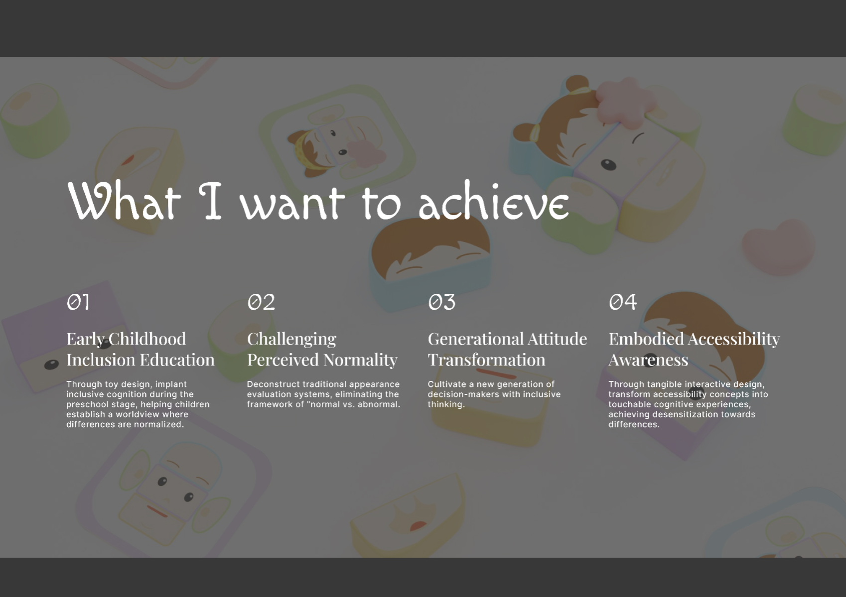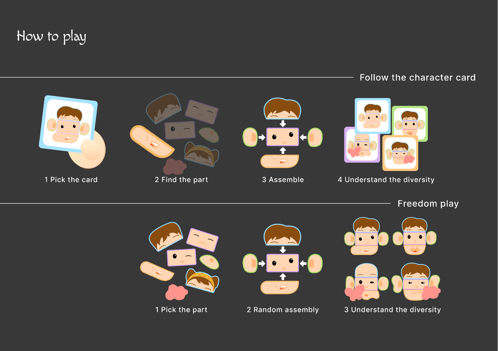 This project utilises buildable toys designed for children aged 2–6 to promote early acceptance of facial differences. By leveraging natural childhood openness, it aims to reshape perceptions of visible diversity through playful, card-guided assembly and free creative play. The toys help normalise real-world facial features, encouraging empathy and reducing bias from an early age.
