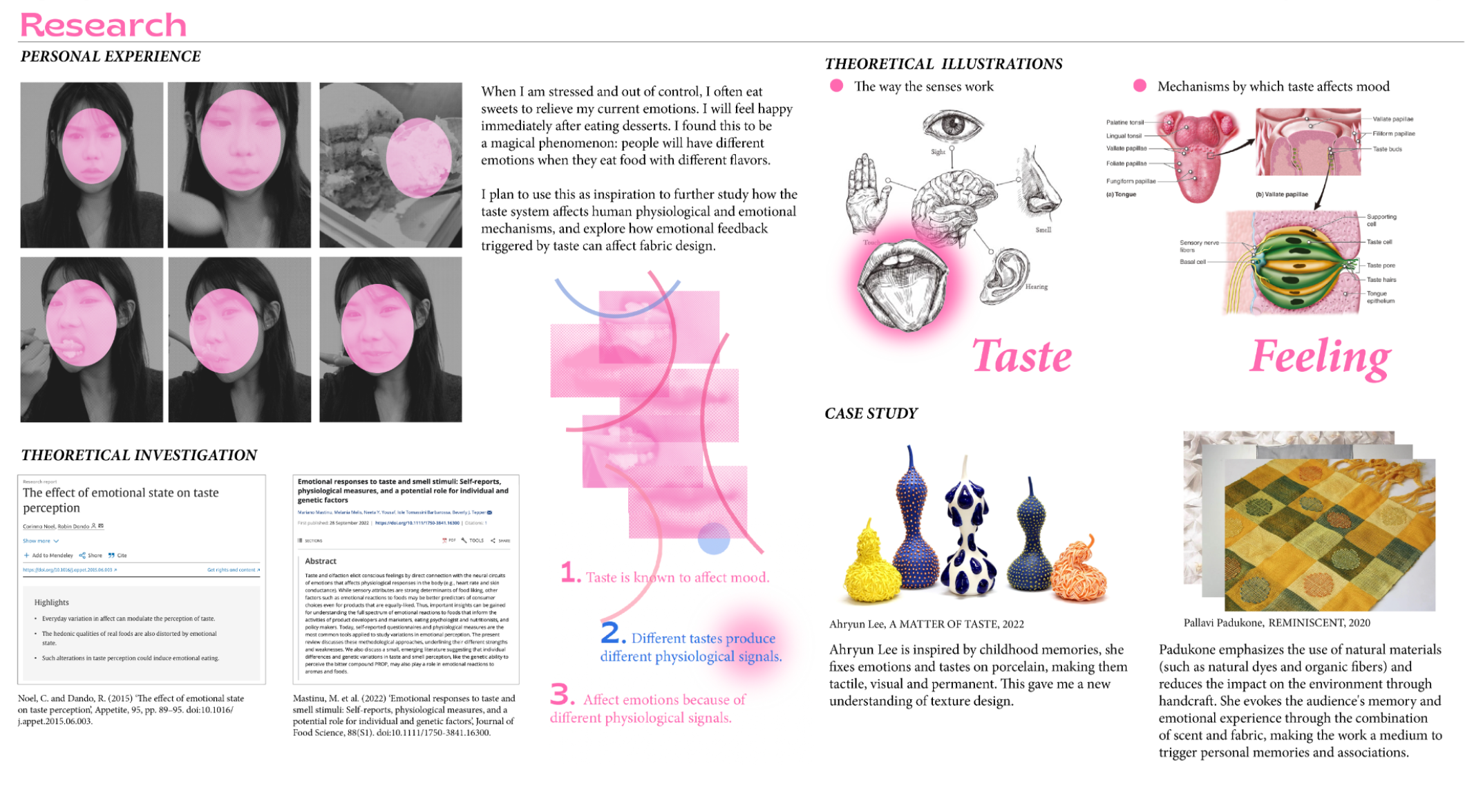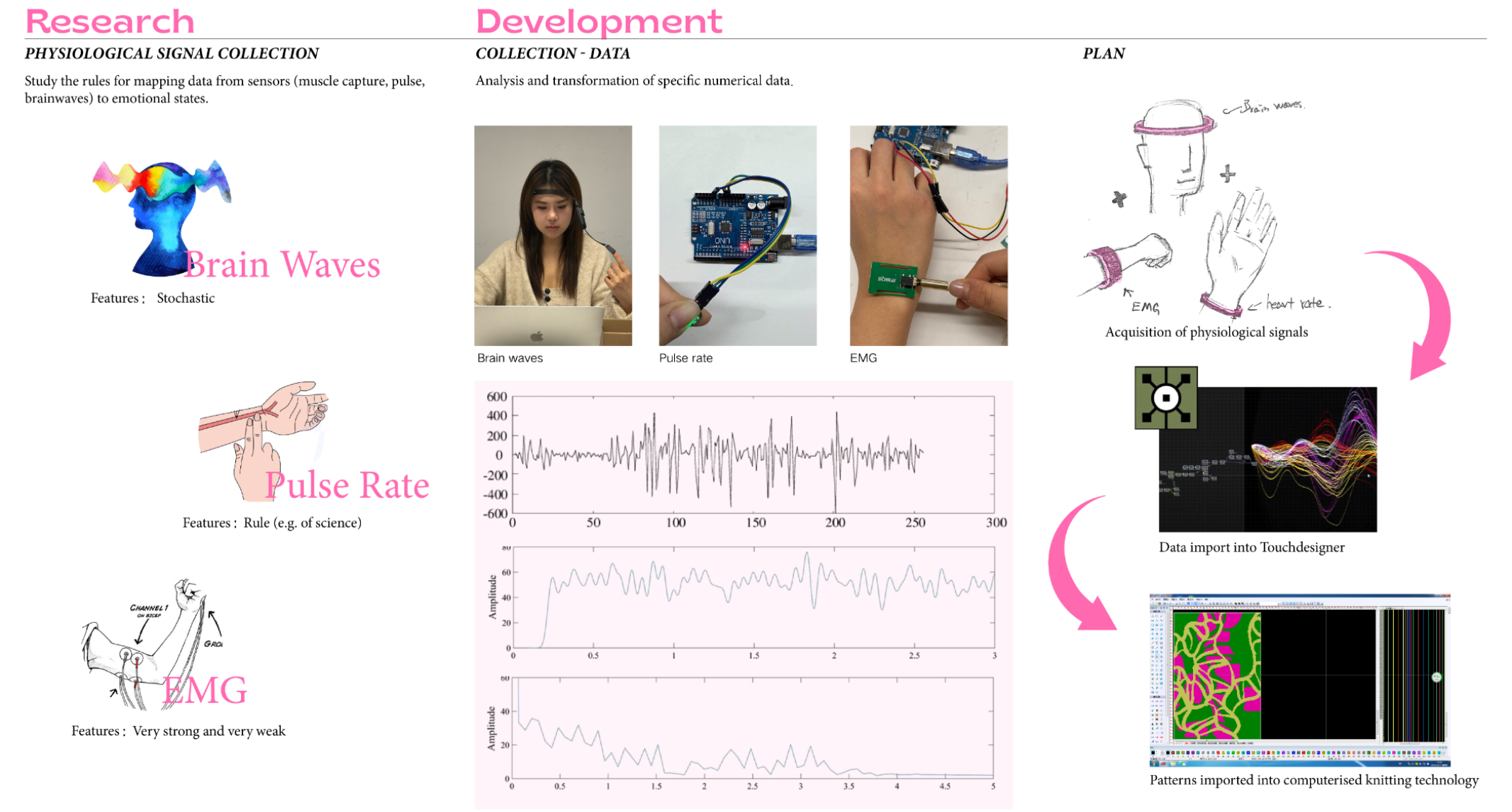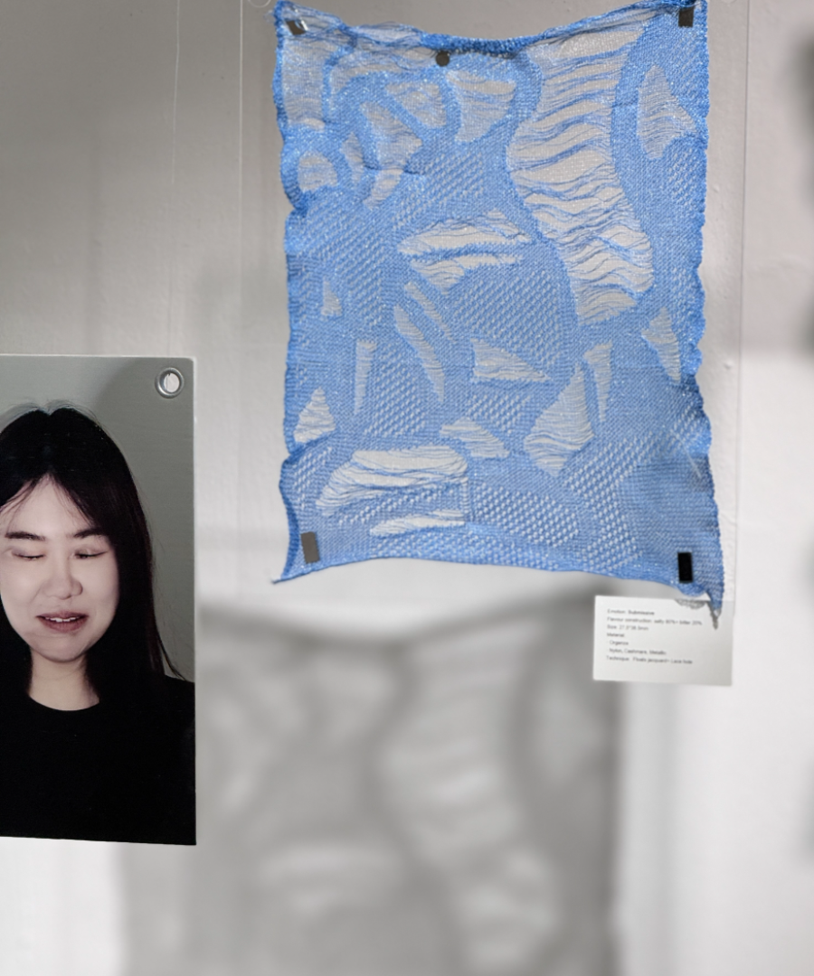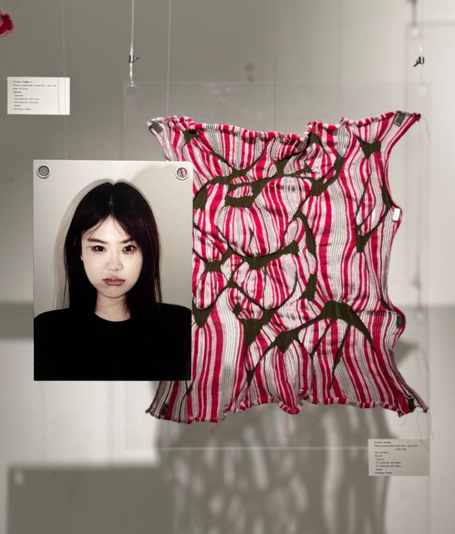 This project investigates the relationship between taste, memory, and emotional regulation. When feeling overwhelmed or anxious, I instinctively reach for sweet food—an emotional coping mechanism rooted in my memory of sweets bringing joy. Research shows that taste can trigger emotional responses through the brain’s short route, where sensory input goes directly to the amygdala, producing fast, instinctive emotional reactions. I conducted taste experiments involving sweet, sour, bitter, and salty flavors, using facial expressions to capture participants’ immediate emotional responses. These expressions reflect simple emotions, which I then classified and recombined into complex emotional states. During tasting, I also monitored biometric data—muscle activity (EMG), heart rate, and brainwaves—using Arduino sensors. This real-time data was visualized in TouchDesigner, generating emotion maps based on physiological changes. These emotion maps were translated into knit patterns, each representing a unique emotional state. I first tested the designs using a domestic double-bed knitting machine to develop fabric samples, experimenting with structure, stretch, and texture. After iterative testing, I programmed my final patterns into a computer knitting machine to create refined textile swatches—what I call “emotional fabrics.” The final presentation integrates these fabrics into wearable forms with stretchable structures, allowing the pieces to move and shift with the body, reflecting emotional fluctuations in real time. The work blends emotional neuroscience, biometric technology, and textile design, proposing a poetic system for encoding and editing emotions through sensory triggers. By transforming invisible emotional data into tactile, wearable textiles, the project creates a new language for feeling, sensing, and expressing emotion.