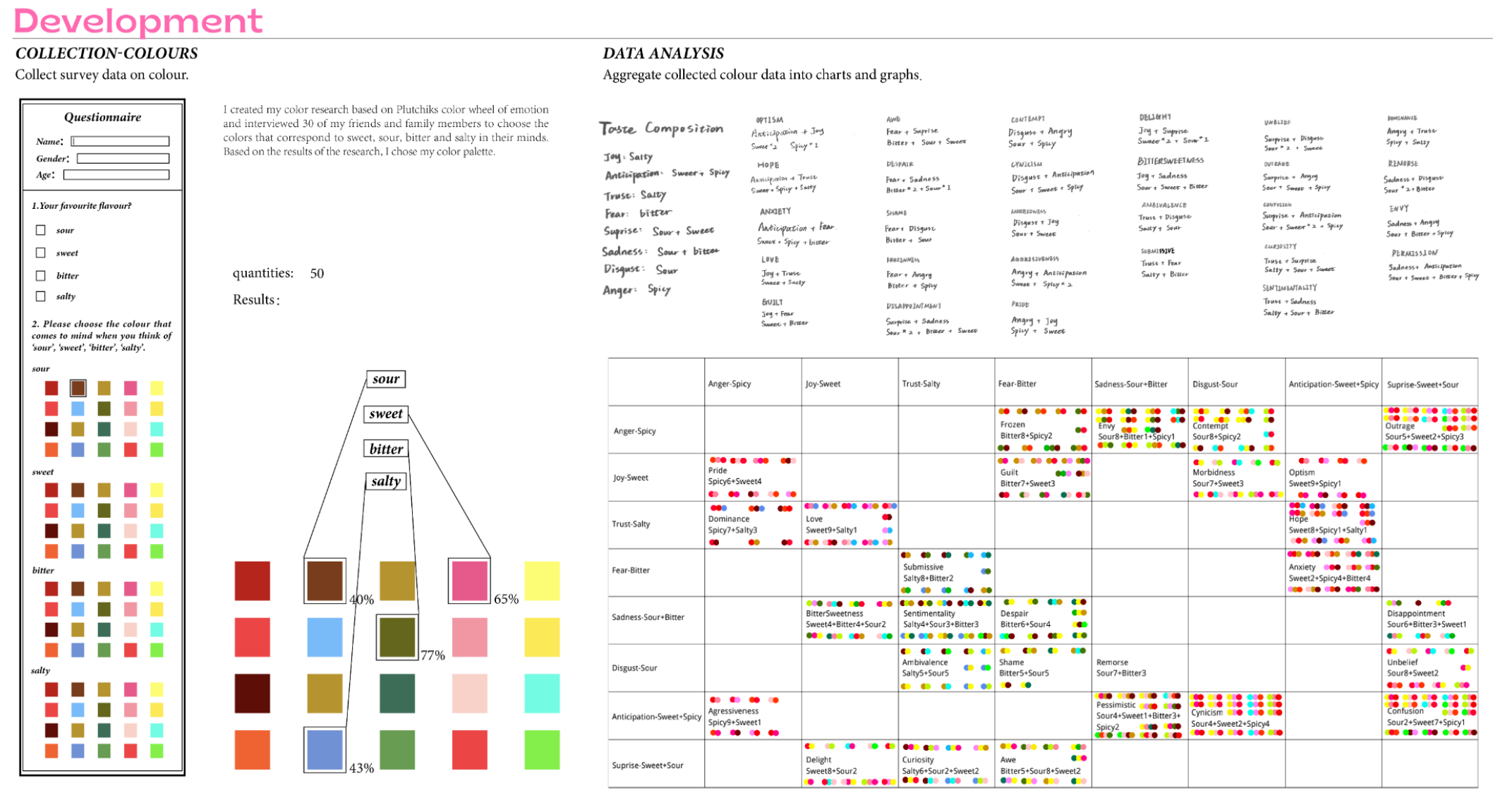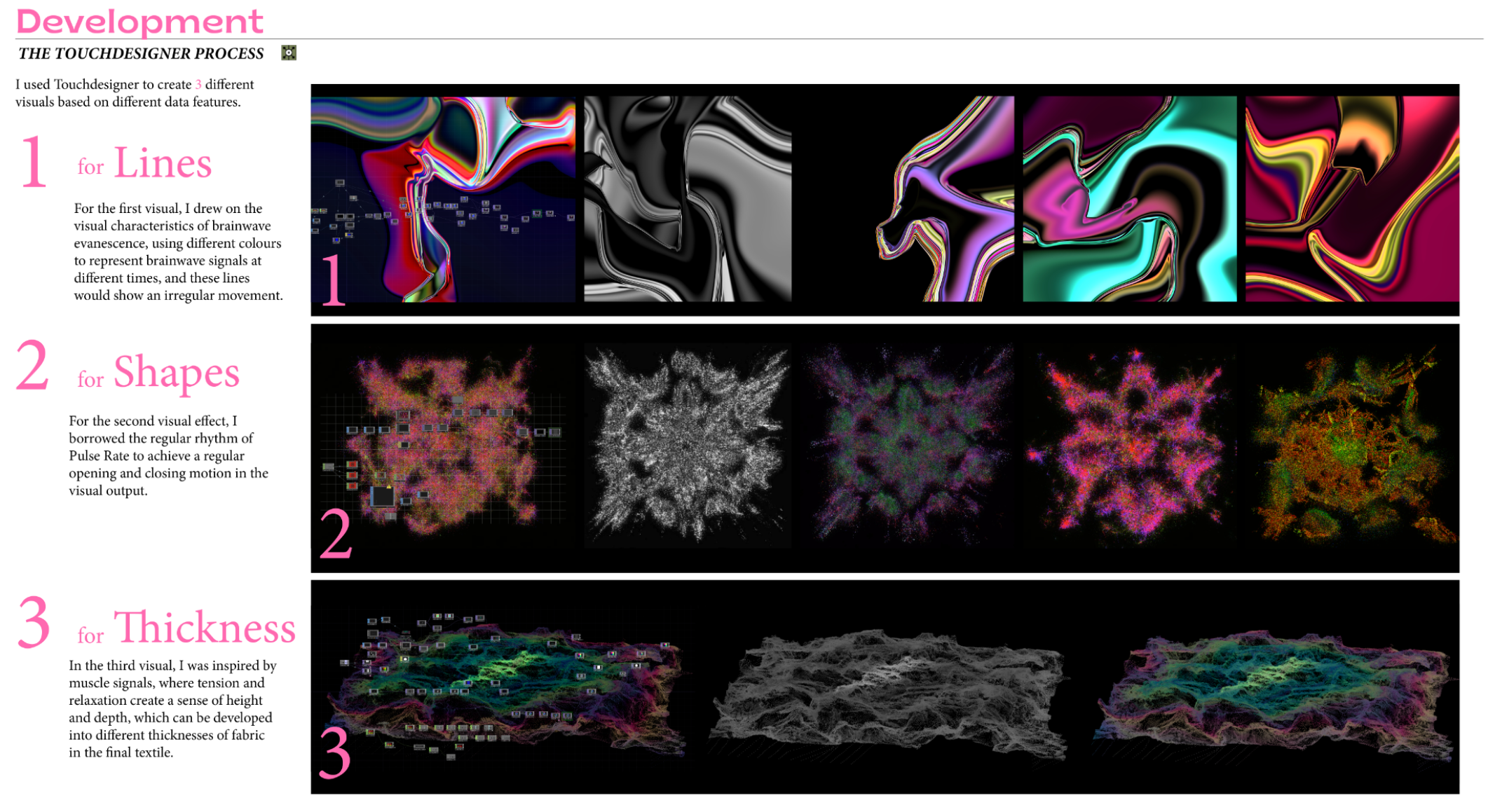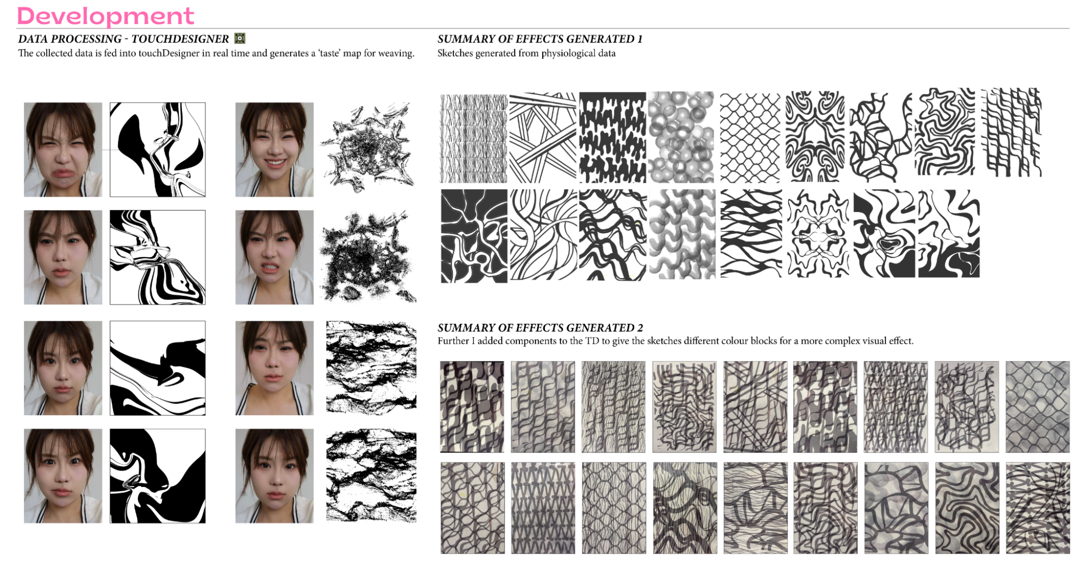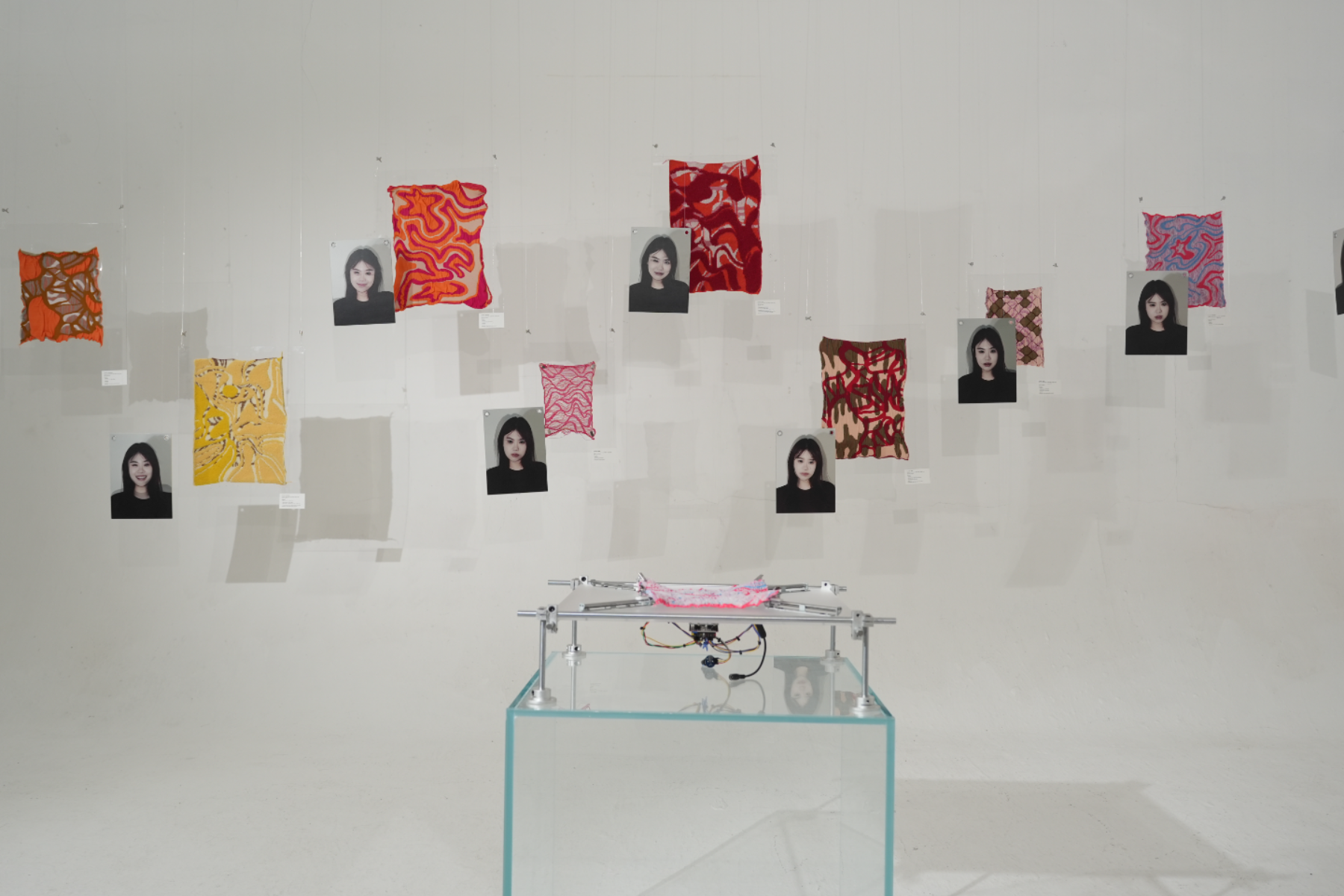 This project investigates the relationship between taste, memory, and emotional regulation. When feeling overwhelmed or anxious, I instinctively reach for sweet food—an emotional coping mechanism rooted in my memory of sweets bringing joy. Research shows that taste can trigger emotional responses through the brain’s short route, where sensory input goes directly to the amygdala, producing fast, instinctive emotional reactions. I conducted taste experiments involving sweet, sour, bitter, and salty flavors, using facial expressions to capture participants’ immediate emotional responses. These expressions reflect simple emotions, which I then classified and recombined into complex emotional states. During tasting, I also monitored biometric data—muscle activity (EMG), heart rate, and brainwaves—using Arduino sensors. This real-time data was visualized in TouchDesigner, generating emotion maps based on physiological changes. These emotion maps were translated into knit patterns, each representing a unique emotional state. I first tested the designs using a domestic double-bed knitting machine to develop fabric samples, experimenting with structure, stretch, and texture. After iterative testing, I programmed my final patterns into a computer knitting machine to create refined textile swatches—what I call “emotional fabrics.” The final presentation integrates these fabrics into wearable forms with stretchable structures, allowing the pieces to move and shift with the body, reflecting emotional fluctuations in real time. The work blends emotional neuroscience, biometric technology, and textile design, proposing a poetic system for encoding and editing emotions through sensory triggers. By transforming invisible emotional data into tactile, wearable textiles, the project creates a new language for feeling, sensing, and expressing emotion.